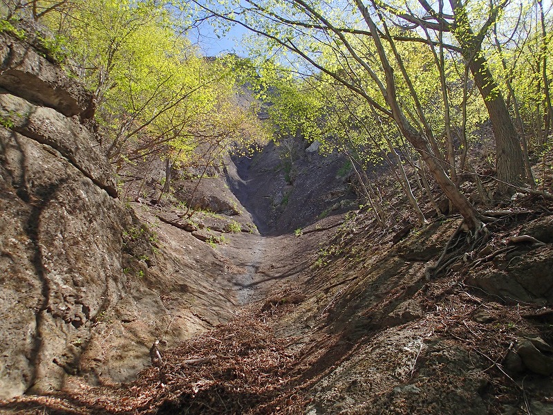 巨大滑り台のルンゼはまっすぐだが、ルートは少し登って左のルンゼ。