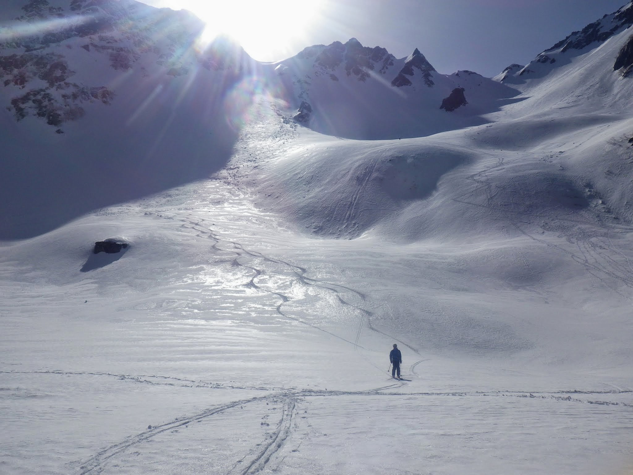 先週は雪崩とデブリの巣だったらしいが、数日前に降った雪でリセットされキレイな斜面。早朝から続々と登山者が上がって行く。