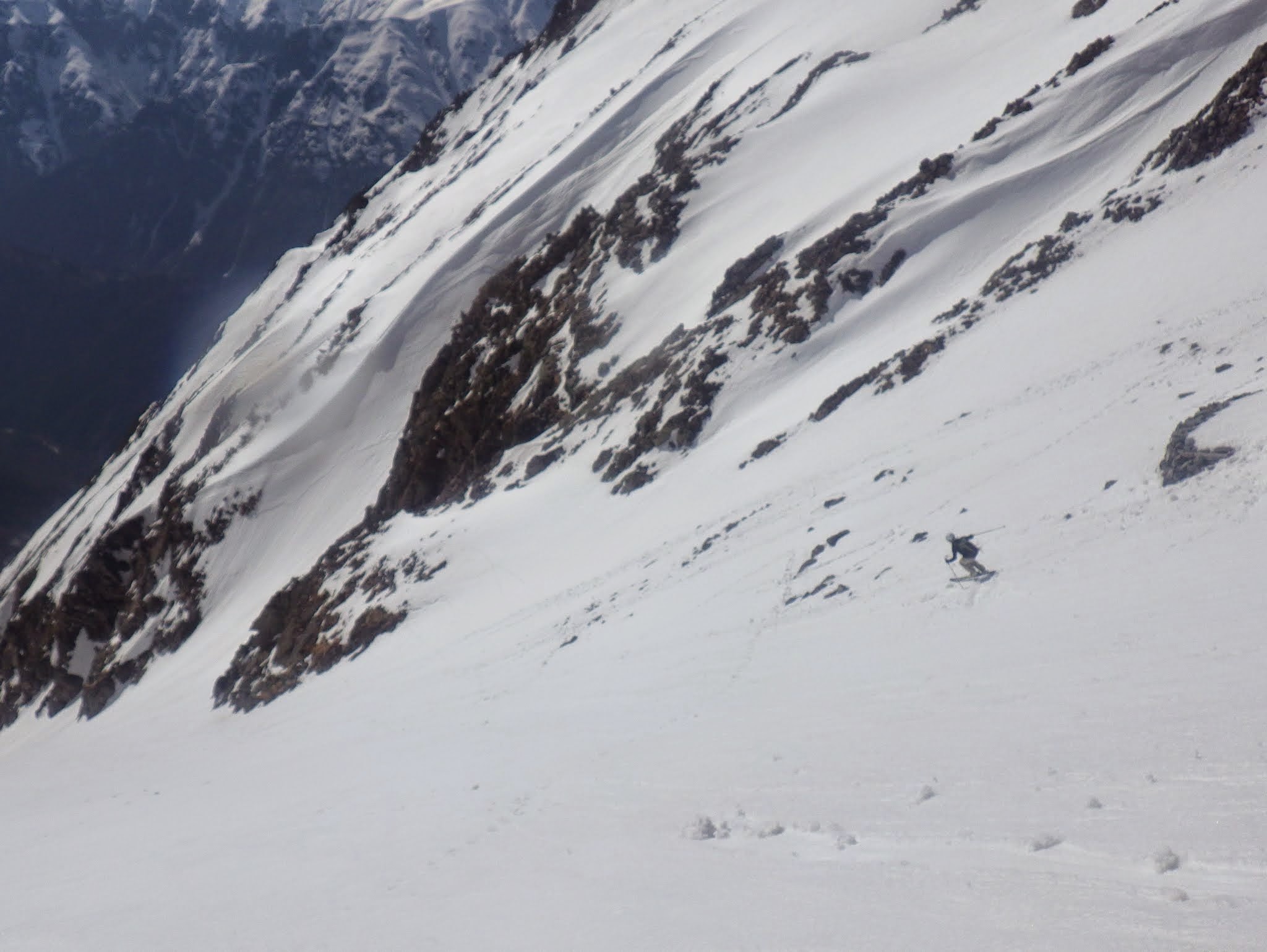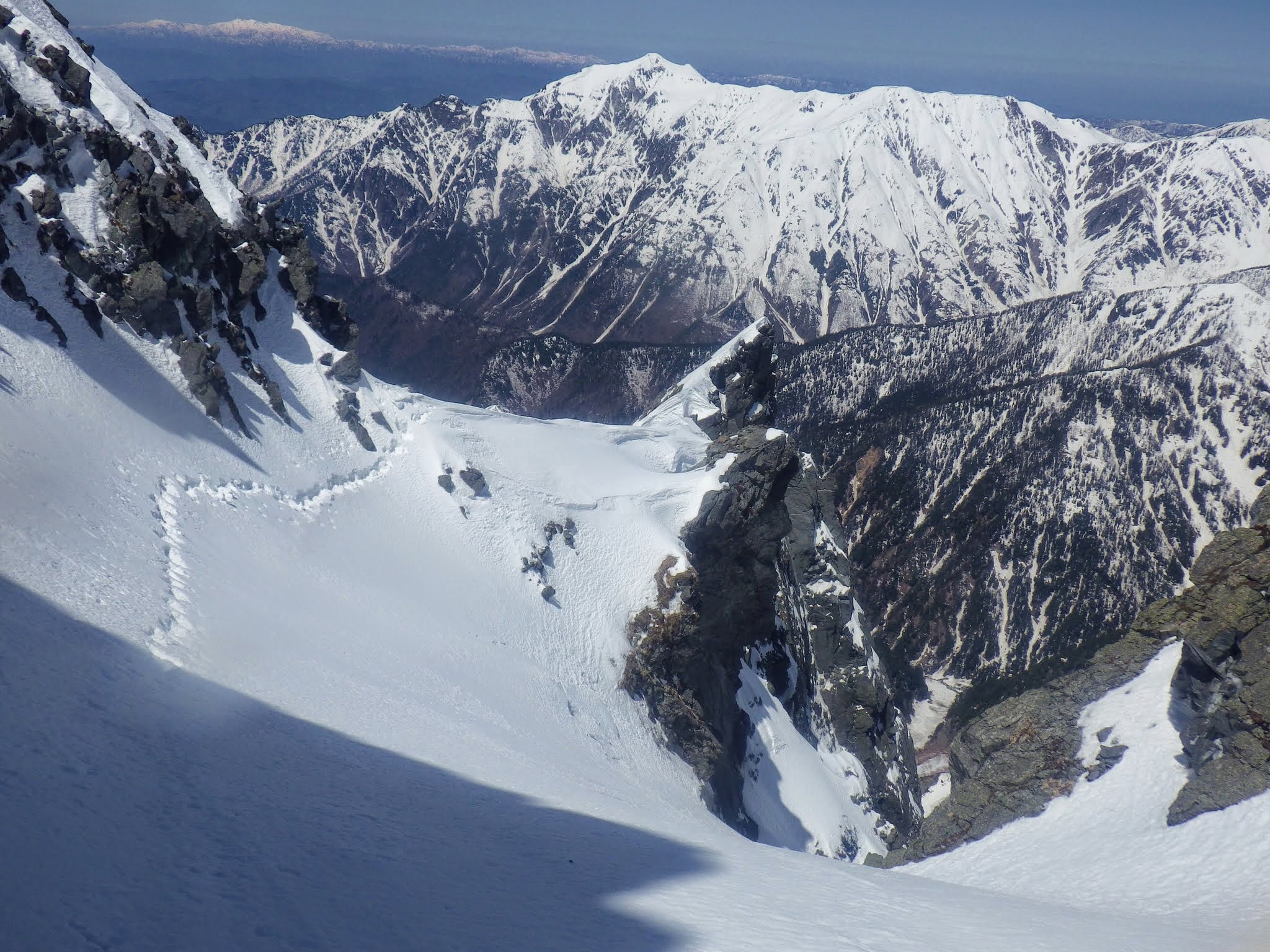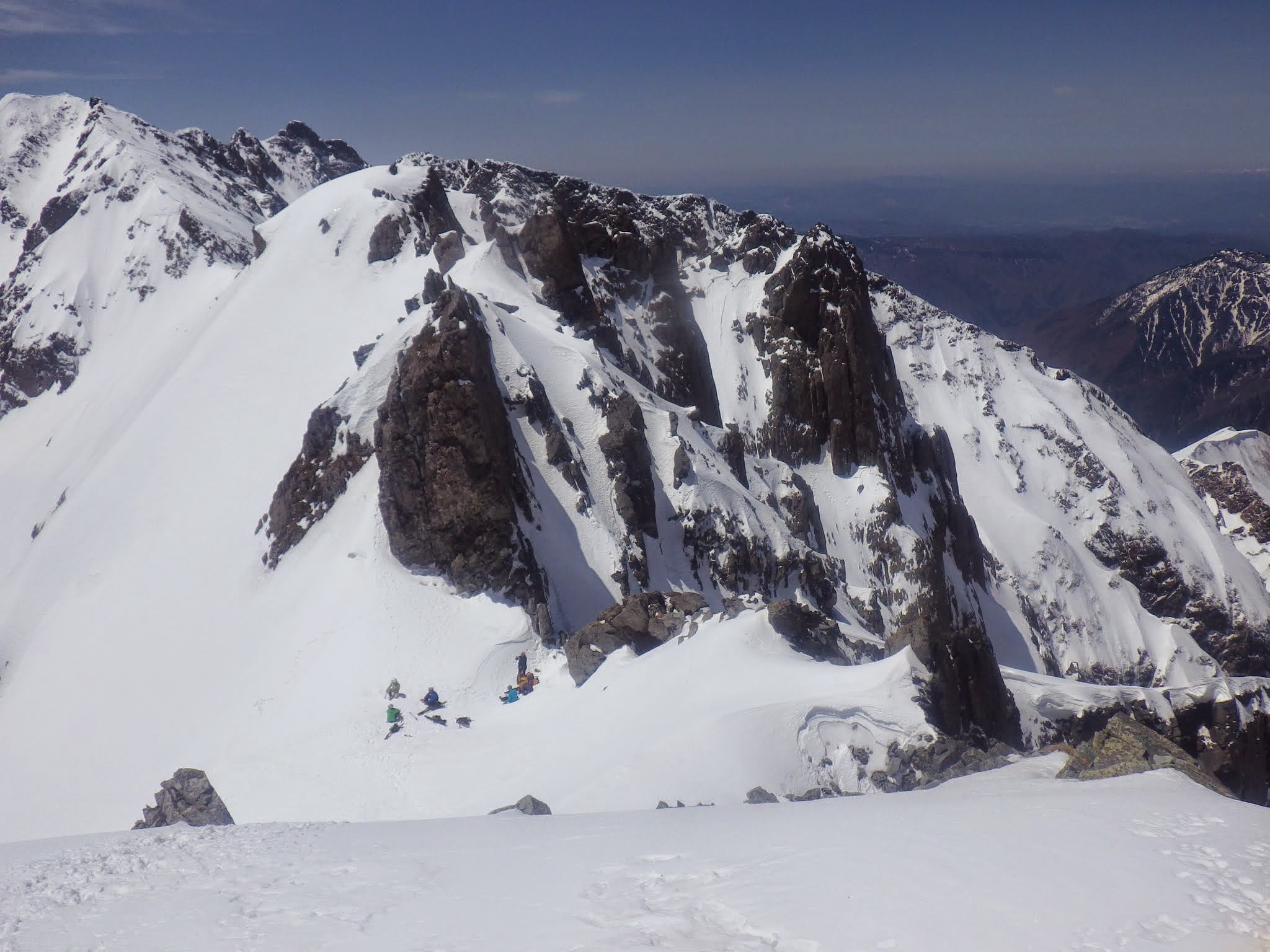 正午頃に再びドロップポイントに行って見ると、大分緩んできてはいるものの以前カタさが残っており、滑ったら一発アウトの急斜面。おまけに下はノールで見えず、その先がどうなっているか分からない。落石や雪崩も怖いし、滑降技術のみならず、氷化斜面での適切な対応力も求められる。今回はM浦さん、S藤さん二人でギリギリのコンディション。