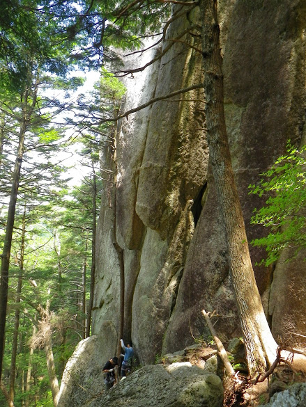 アプローチは植樹祭駐車場から25分ほど。末端壁に向かう道と途中で別れ、沢筋を詰めていけば、左手に大きな壁が見えてきます。