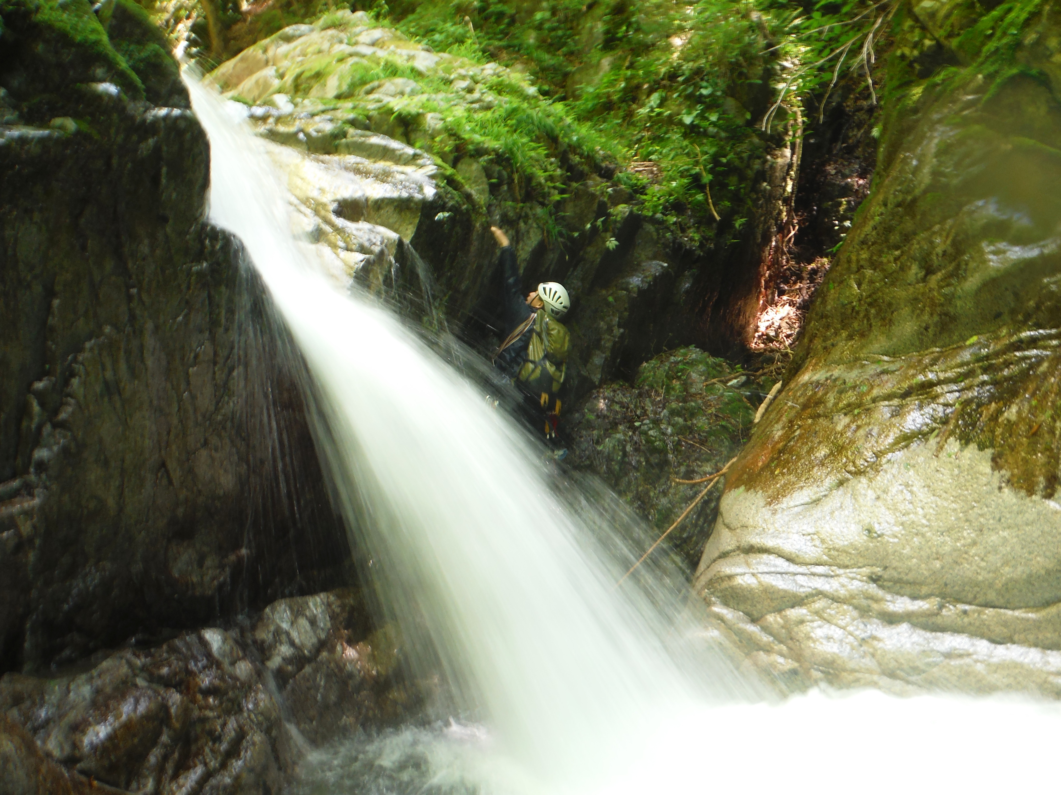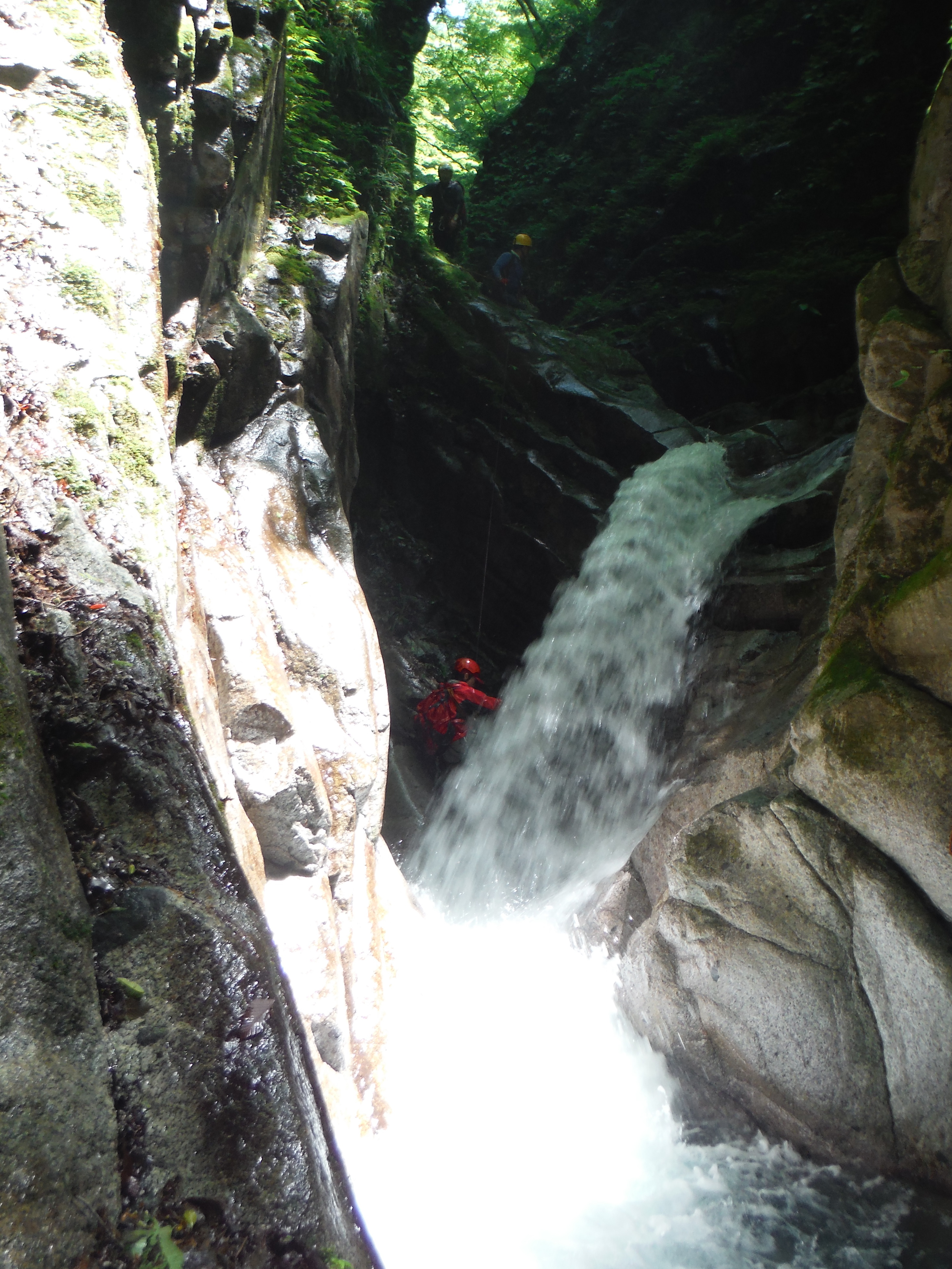 途中、4m程の釜を持った滝。ヘツリ気味のルートに残置スリングが2本ぶら下がっているが、どうみてもツルツル。