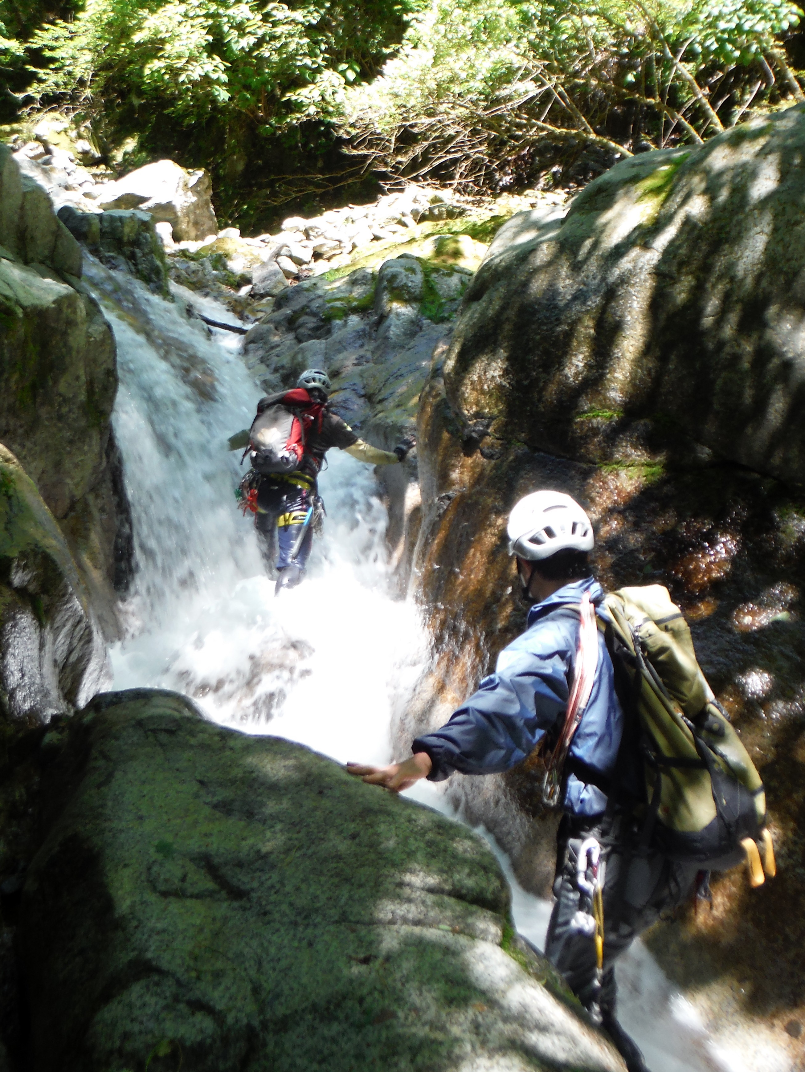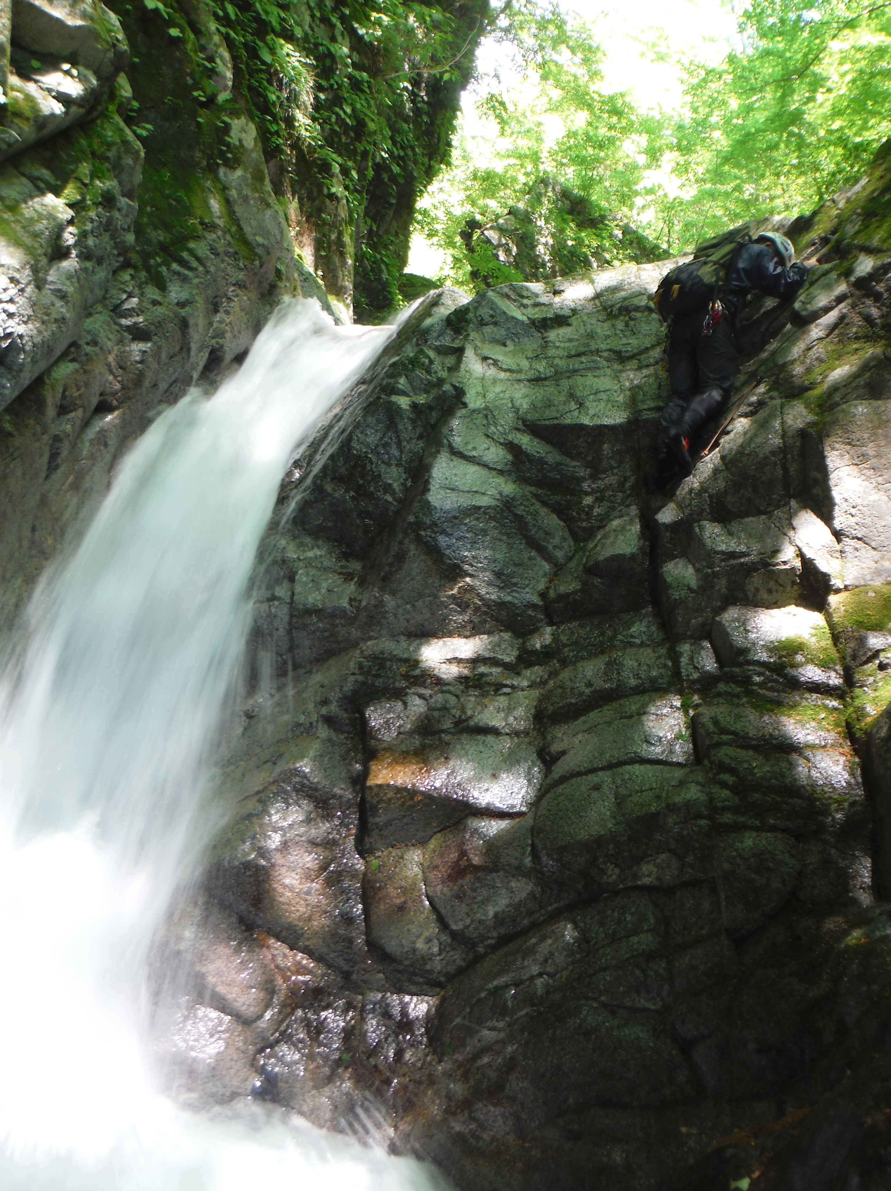 石棚ゴルジュを抜けた先の大滝は、水流を直登するのは無理で、右岸のルンゼから草付きの壁を登る。