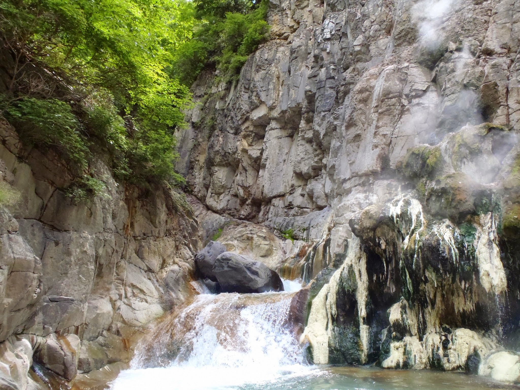 先にタープだけ張ってまずは噴泉塔見物に行く。かつては噴泉塔まで道があったらしいが橋はすべて壊れ往時の面影はない。噴泉塔は去年の記録によると壊れて見当たらないということだったが、温泉が噴出してる塔のできかけのようなものはあった。それにしてもここは噴泉塔以外も滝やら釜やらがかっこよくてなかなか見栄えのするいいところ。わざわざ見に来た甲斐があった。
