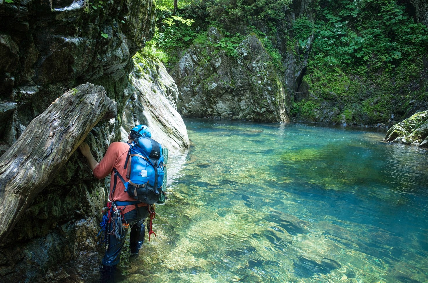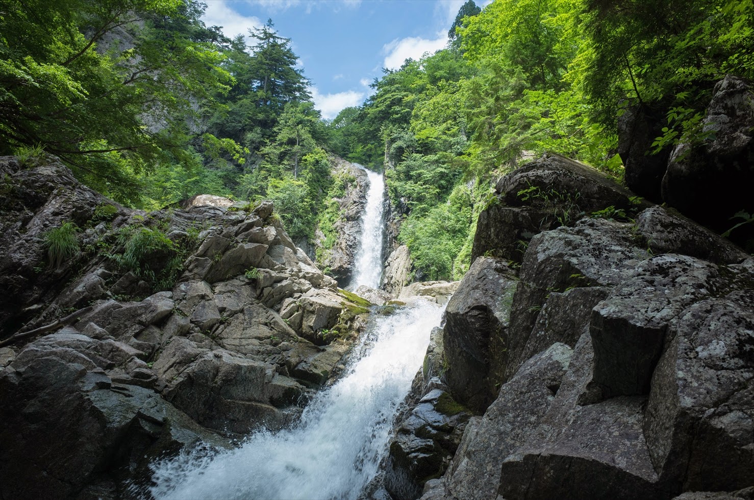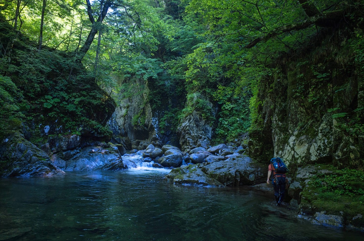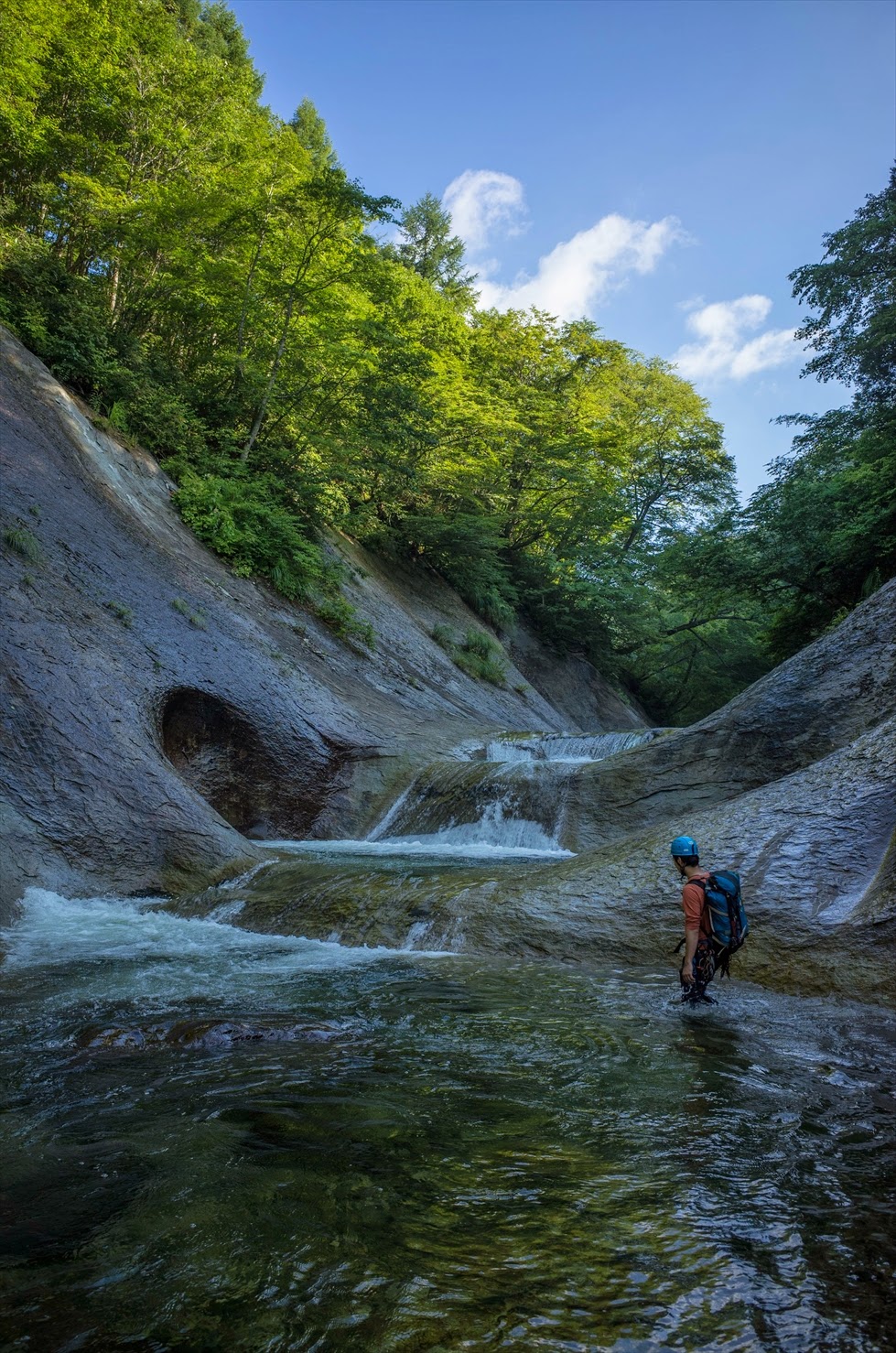 前夜は満点の星空、この日も朝から快晴。強烈な日差しのもと入渓する。10分ほど歩くと白滑八丁。延々と続く滑床を慎重にへつり、時には壁走りも交えて遡行する。