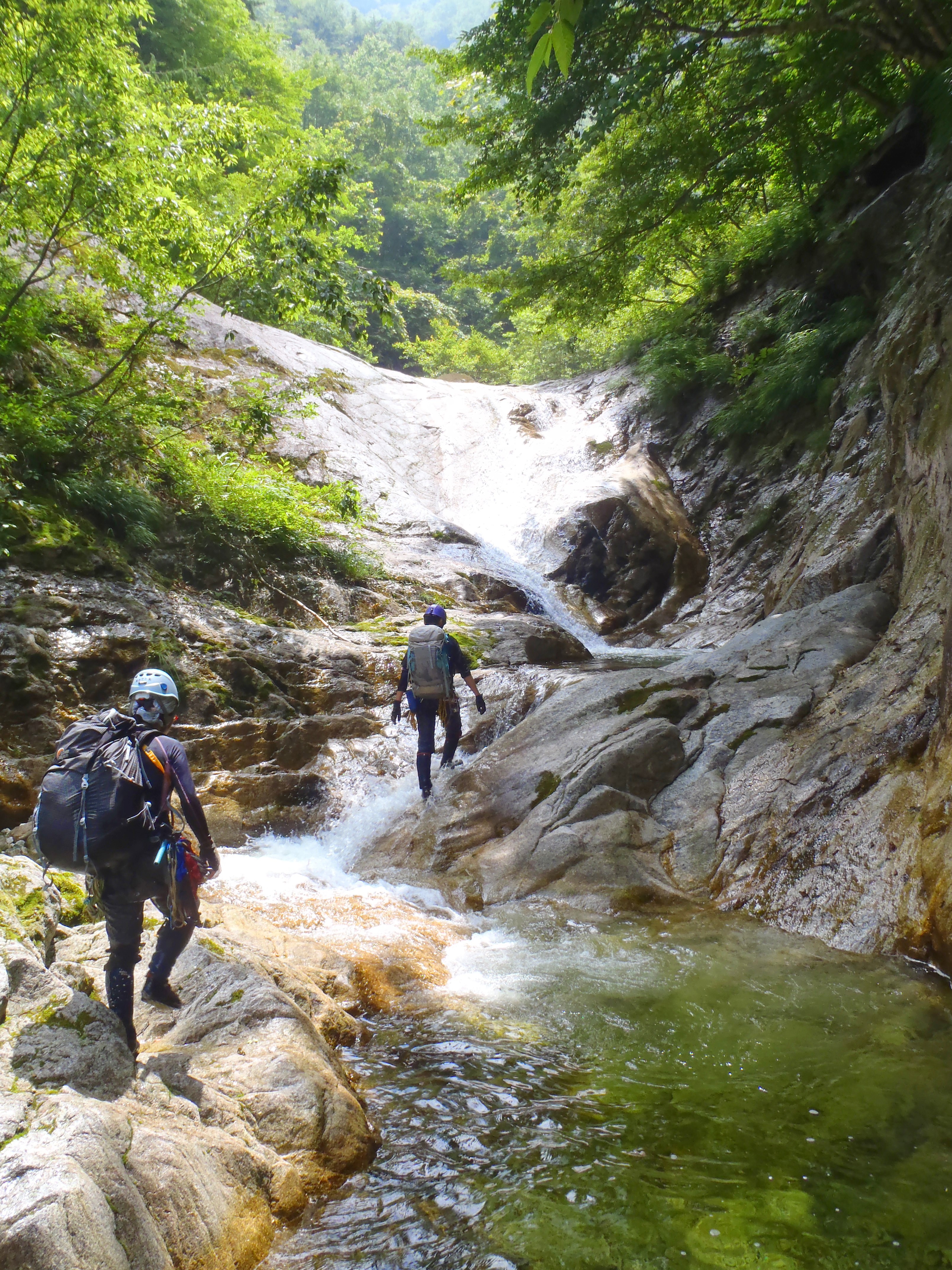 身支度を整え、冬に何度かアイスで訪れた荒れた林道をテクテクと1時間20分ほど歩き、林道終点でガチャをつけ、残地ロープのかかる滑りやすい急斜面を下降し、尾白川本流へ入渓。