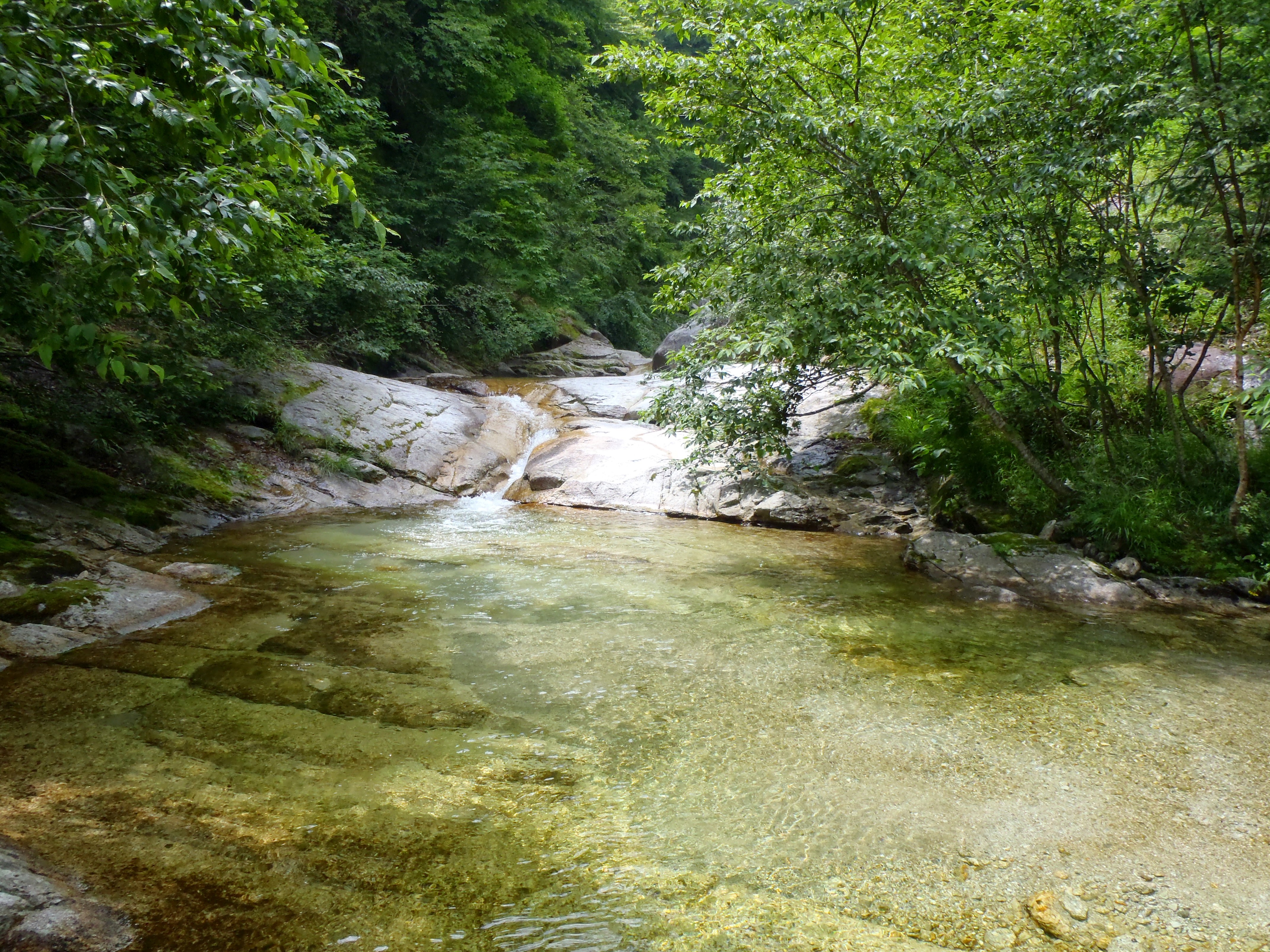 鞍掛下流はウォータースライダーできる箇所が何個かあり、エメラルド色のプール状の広い釜もあり。
