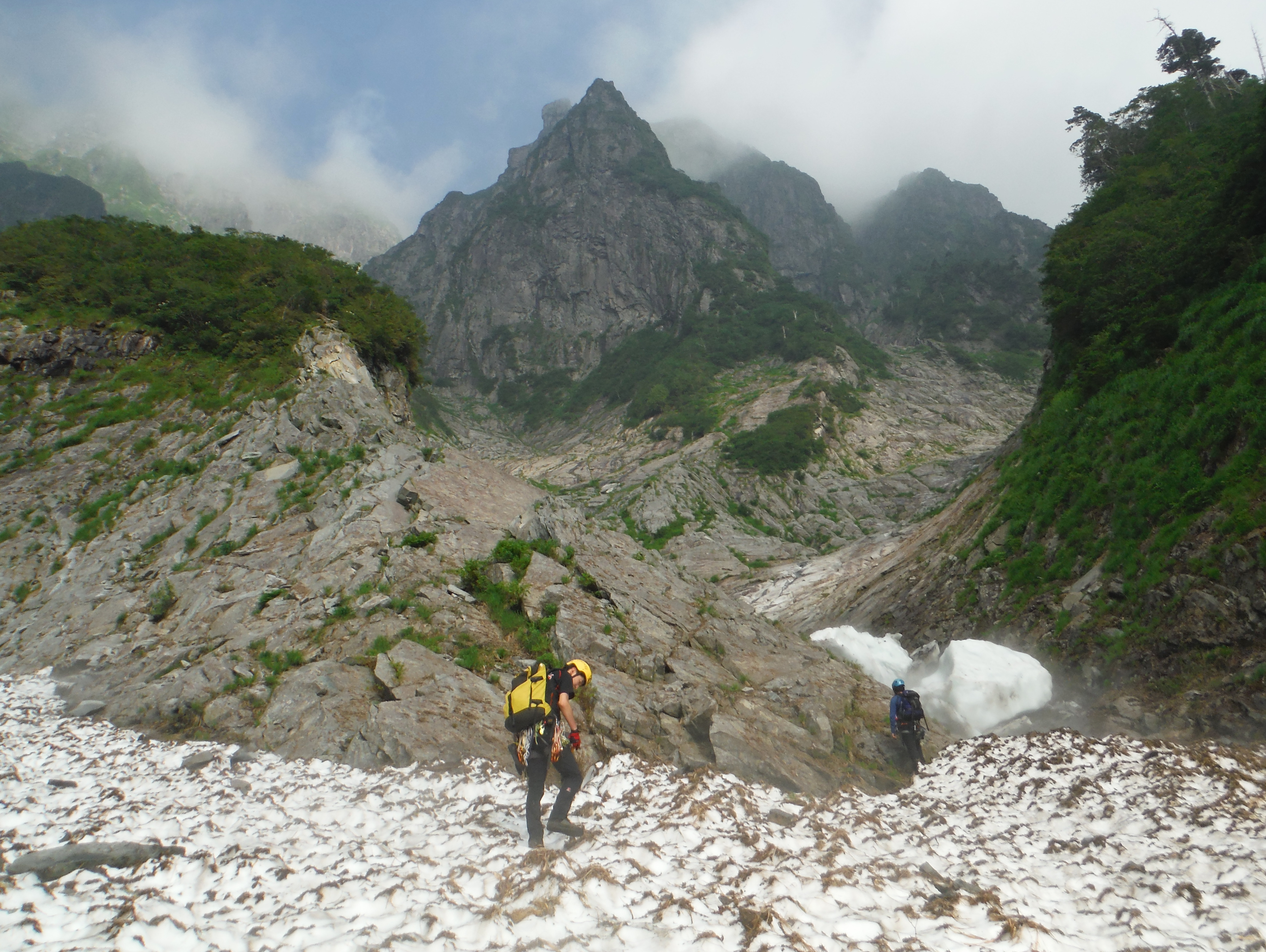 すぐに踏み跡は薄くなり、進むのが難しくなる。雪渓も上から見ると、しっかり残っていたので、戻るよりも懸垂で雪渓に降りた方が安全と判断したが、なぜかそこだけ雪渓が崩落していて下降は困難。Y本さん登り返す。結局、ロープで確保しながら元来た道を戻る。そうこうしているうちに1時間半をロス。3パーティーに抜かれる。