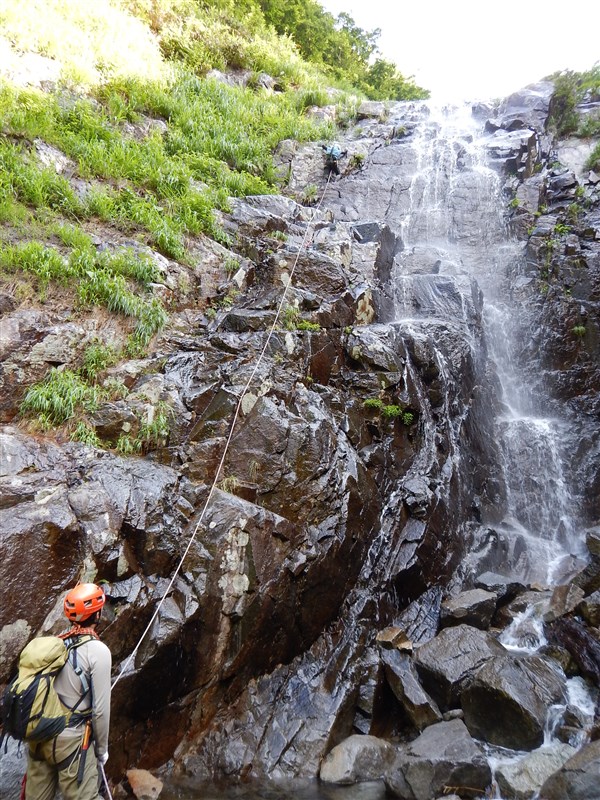 入口に掛る4mF1を越えるとすぐに出てくる15mF2がこの沢の大滝。S子さんが左壁をリードし、50mほぼいっぱいまで出た40mスラブ滝下部でハーケンを打ってビレイ。そのままD介さんリードで40mスラブ滝上部まで登ってロープ登攀終了。