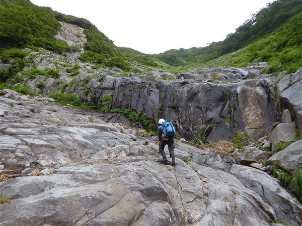 次の5m滝は上部のトラバースでしっかりした支点が取れず、一旦下りて左岸巻き。滝から上のスラブ帯は乾燥した岩登りになるはずだったので、Sはフェルトシューズをクライミングシューズに履き換えた。予想に反して断層帯と呼ばれる所までは濡れたスラブだったが、例え濡れた岩であってもクライミングシューズの威力を認識。