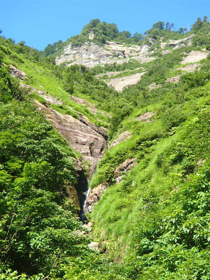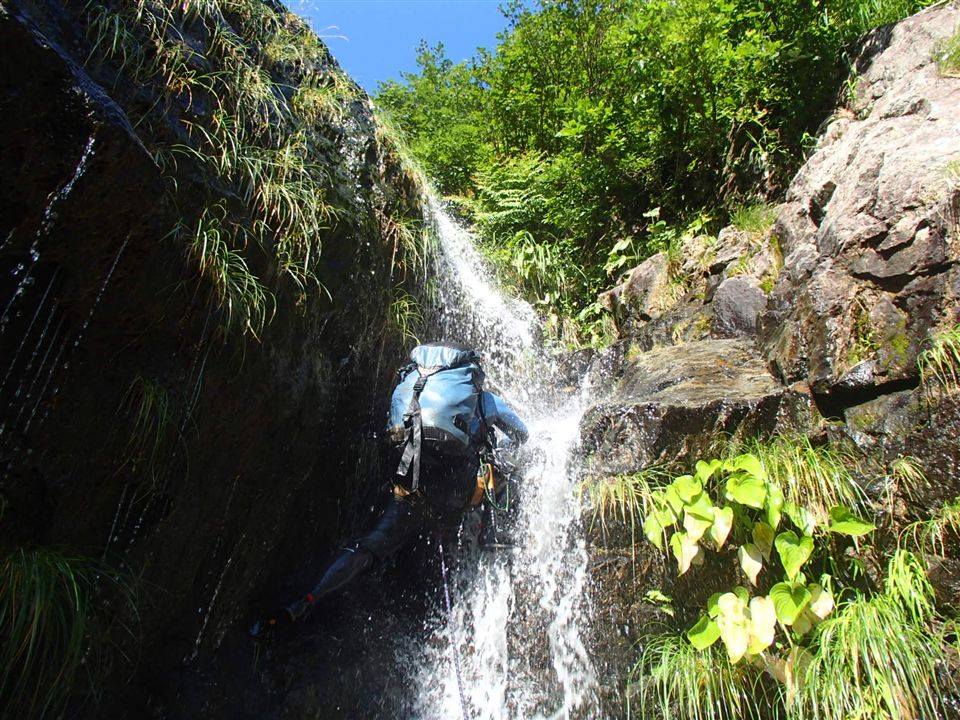 駒倉沢は流程は短いが遊べるミニゴルジュ、草付スラブのV字谷の渓相、登れる連瀑帯、スラブ帯、トイ状つるつるナメと変化に富みなかなか楽しめる沢。