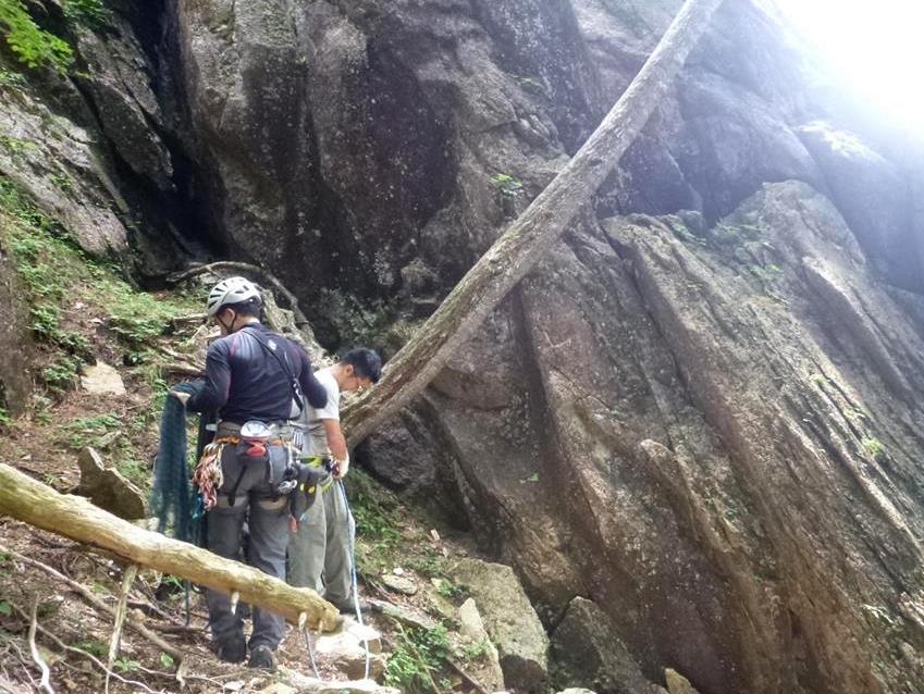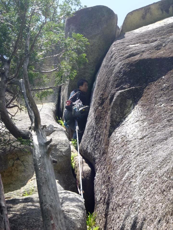 身の危険を感じるほど脆い同ルートを避け、ルンゼを少しあがったところにある倒木を使って登っていく。難易度は5級ほどだが、絶対に落ちられないところ。