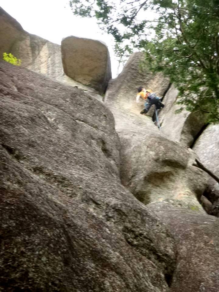 すっきりとした岩に美しいクラックが走っています。牛乳びんクラック(5.10c)は、ハング下を右にトラバース部分が少々気持ち悪いが以外と簡単。核心は、どちらかと言えば上部のカムをきめることができないワイド部分でしょうか。気合いで抜けましたが、ワイドの先は一瞬?となる岩の形状。ルート名の由来が何となく分かります。