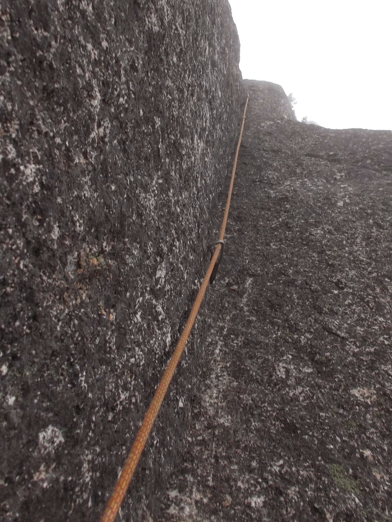ザックがあればハーネスからぶら下げて。とても緩い傾斜なので上に乗ったらスラブを歩いてゆけるが、、、支点はほぼゼロなので怖いときはチムニーを最後まで詰める。