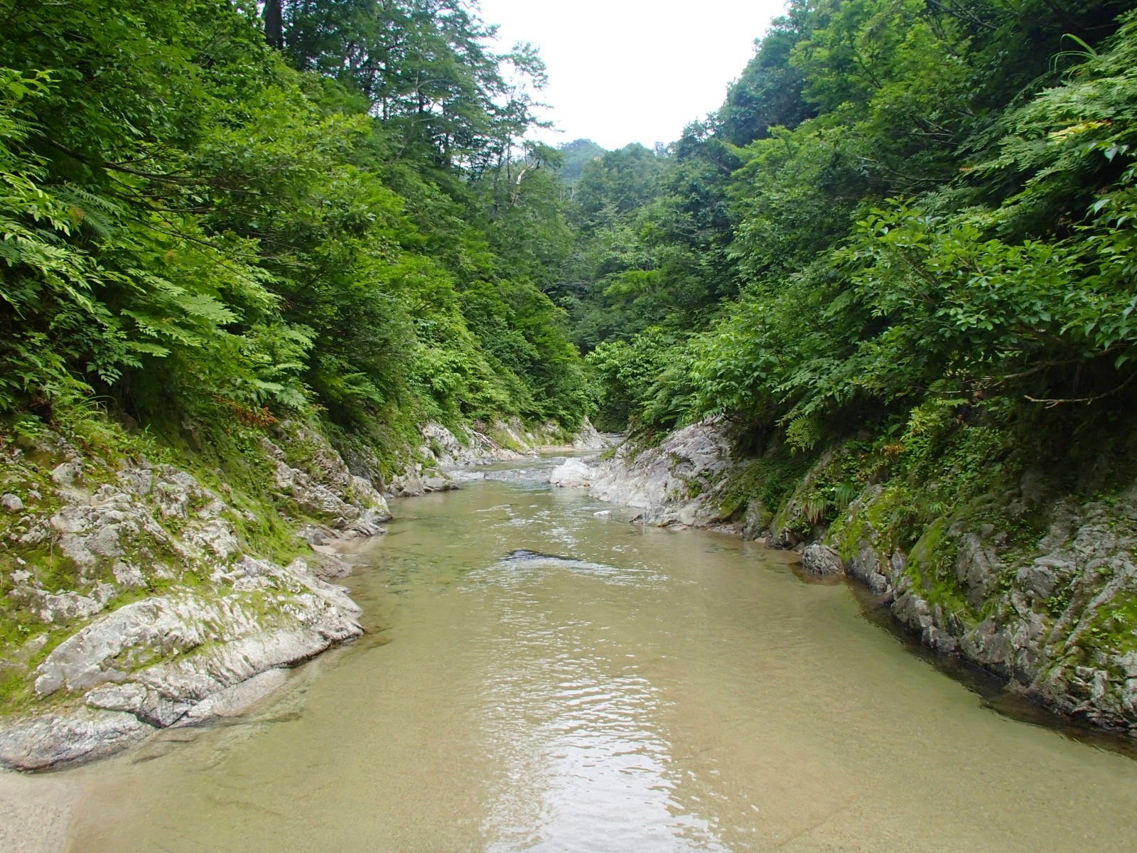 ゴルジュはくねくねと曲がり、両岸は高く一寸先の状況は判らない。閉鎖された空間だけど威圧感はない。