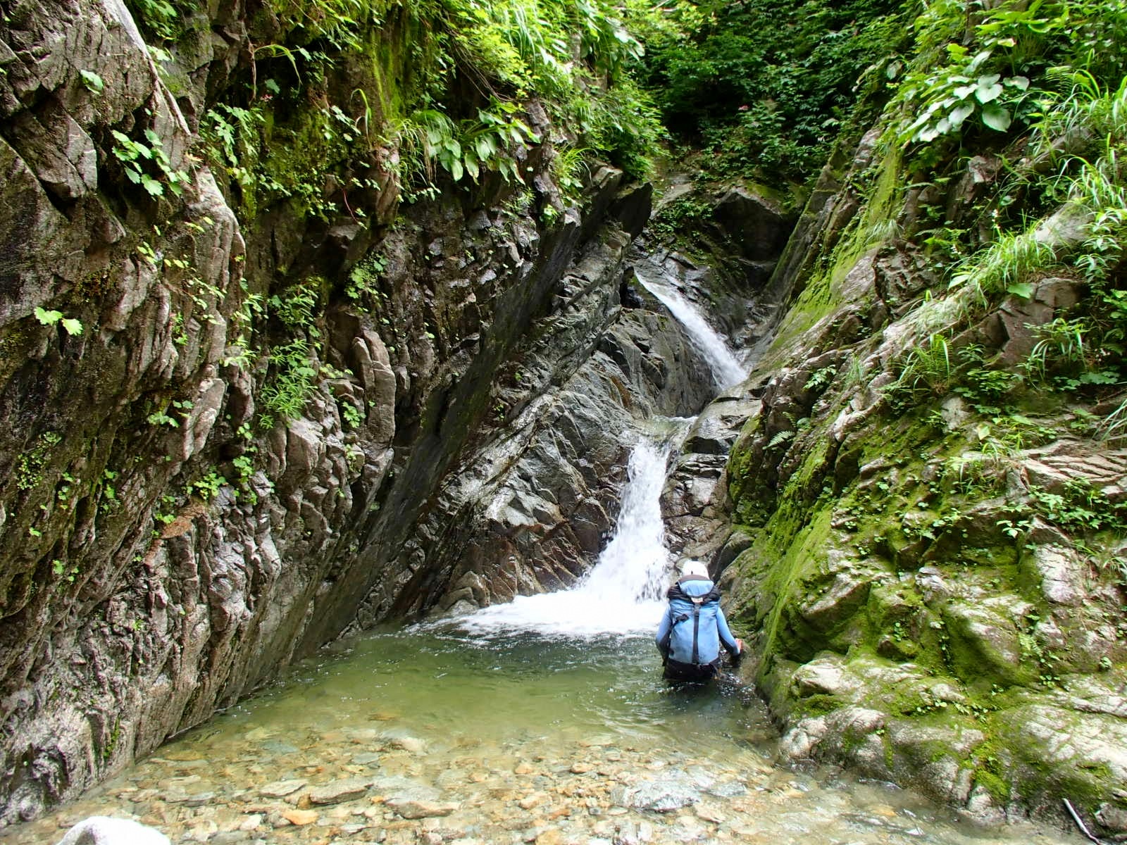 その後2段の滝が現れる。下段はロープを出して上段を左岸から巻き上がったあたりで両岸の傾斜はいったん緩む。