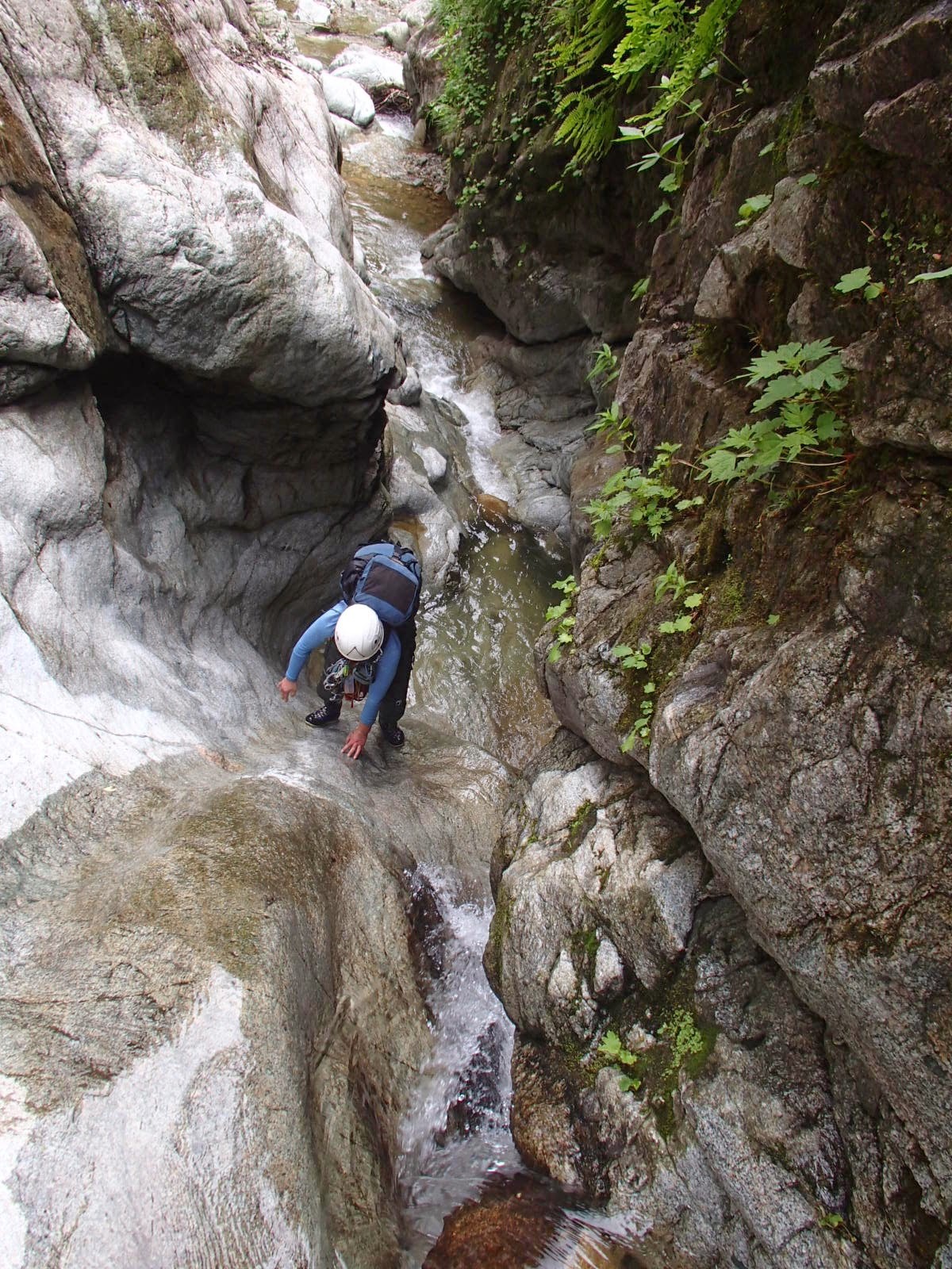 右岸がハングした狭いトイ状の滝を越えていくと、徐々に両岸が圧縮され、幅1mほどの白い井戸底ゴルジュが始まる。
