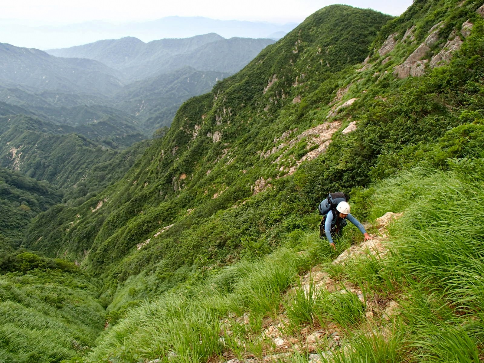 稜線が近付くにつれ沢型も細くなり、草付きの中のスラブをひろっていき、最後は10分間のヤブコギで登山道へ出た。