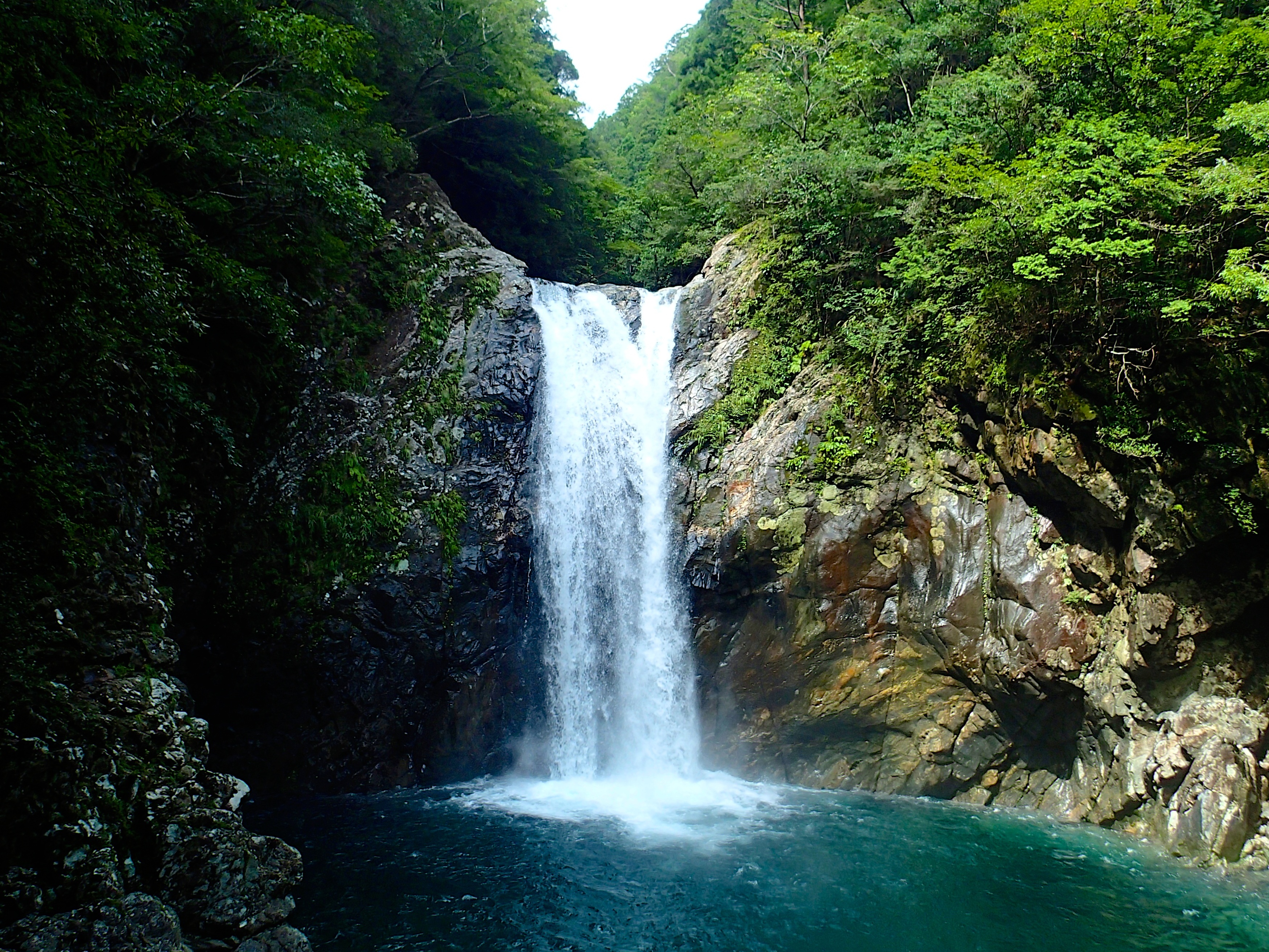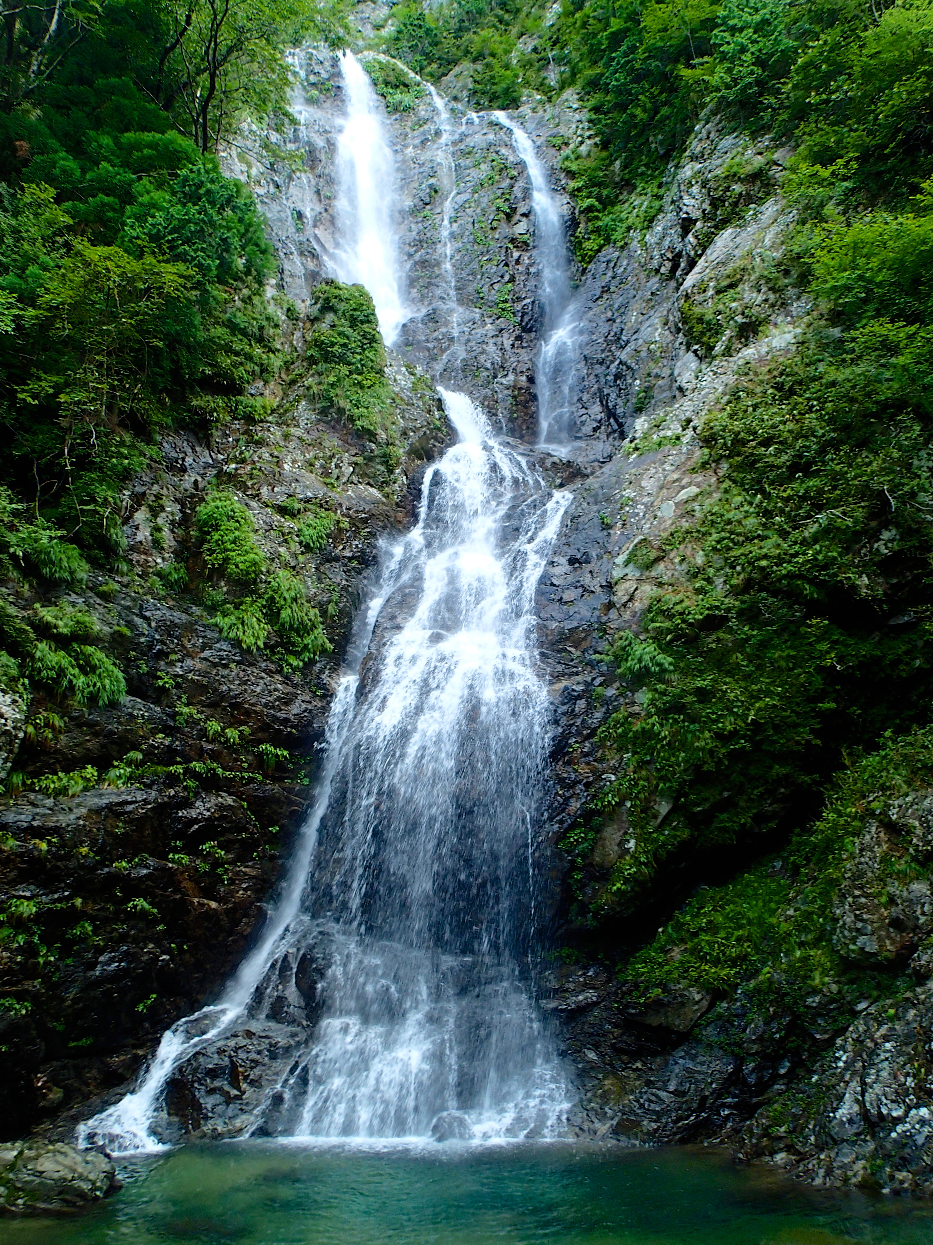 大滝下部は比較的登りやすいが、水量がありそれなりに緊張感を強いられる。大滝上部はさらに斜度が立ってくるが、支点を取りたいところに折れた木が横たわっておりやっかい。大滝の上からは熊野灘が一望でき、岩井谷遡行の達成感と相まって最高の気分。