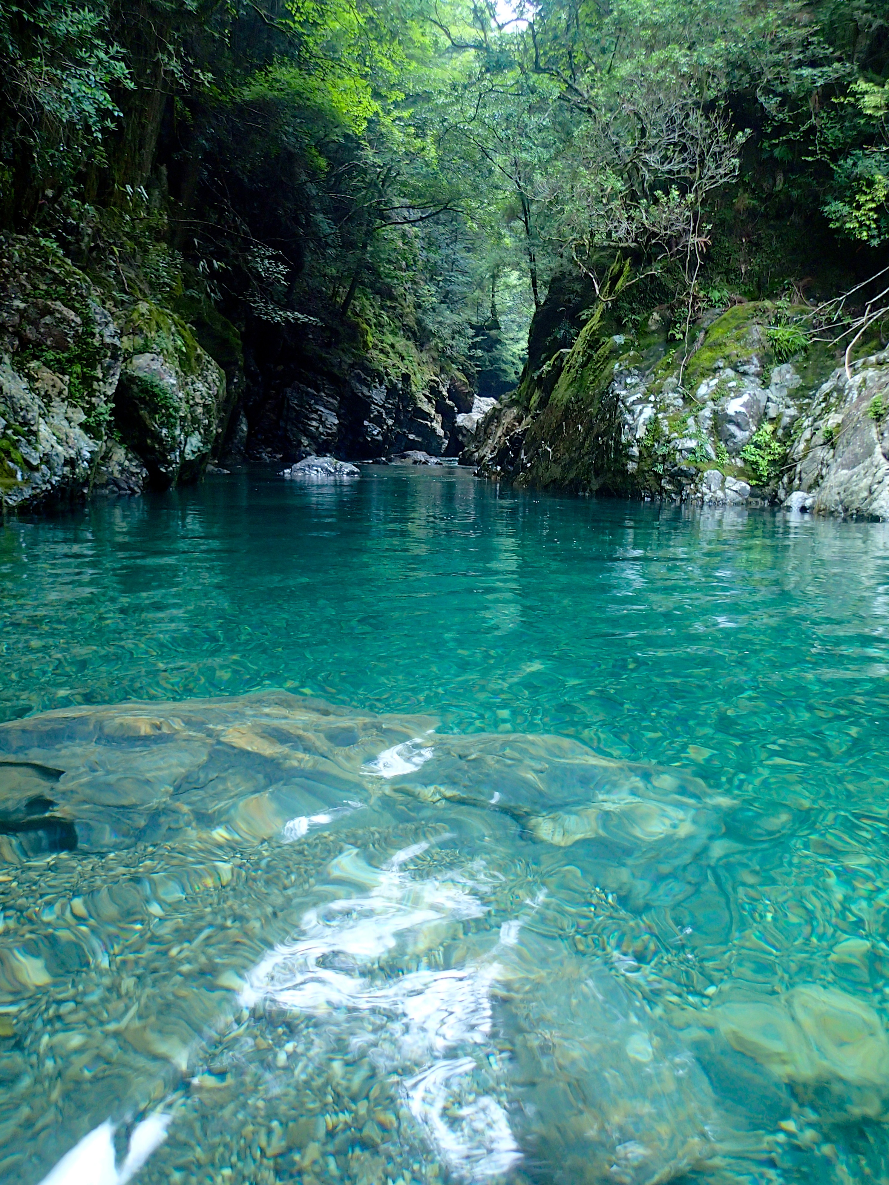 沢は途中で一旦伏流になるが、すぐに復活する。沢中を見渡すと明らかに流れがないところに紺碧の淵が佇んでおり、近寄ってみると気泡から湧き水が出ているのが確認できる。