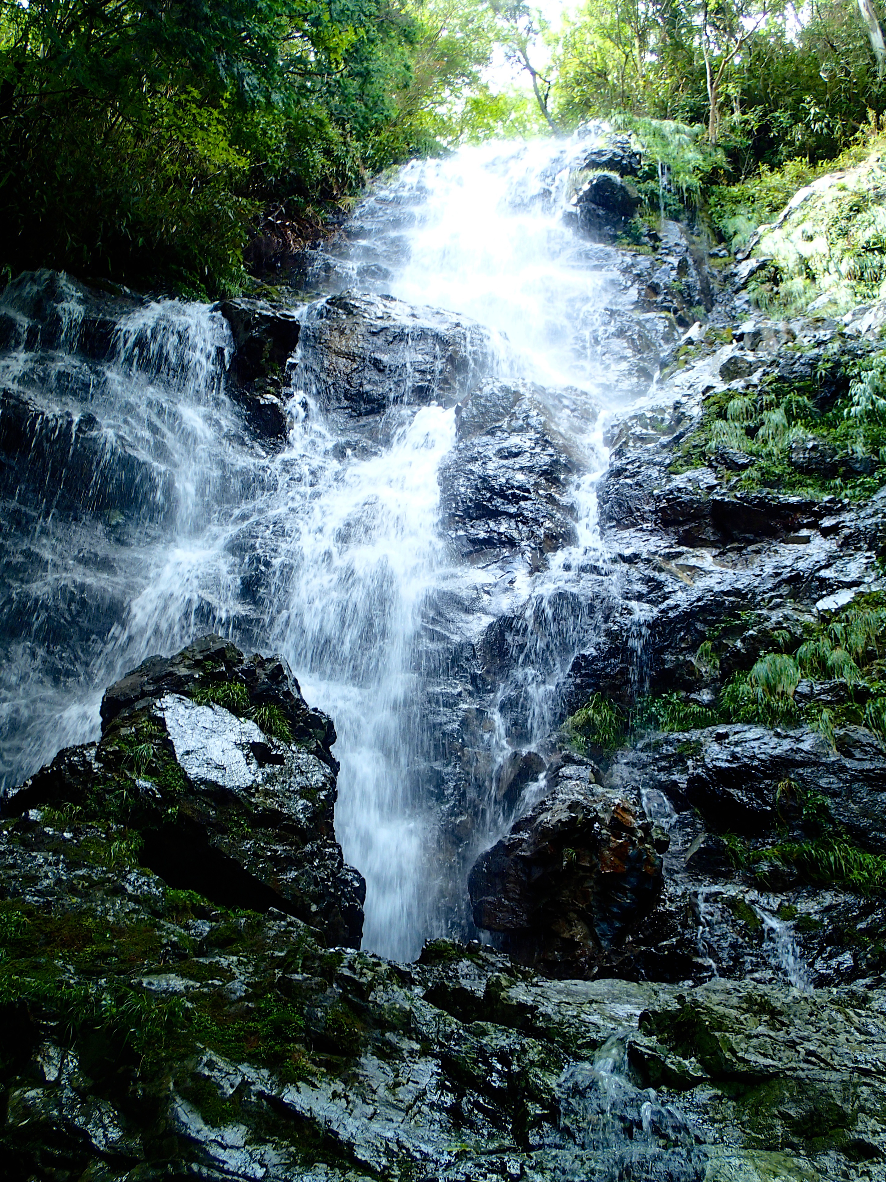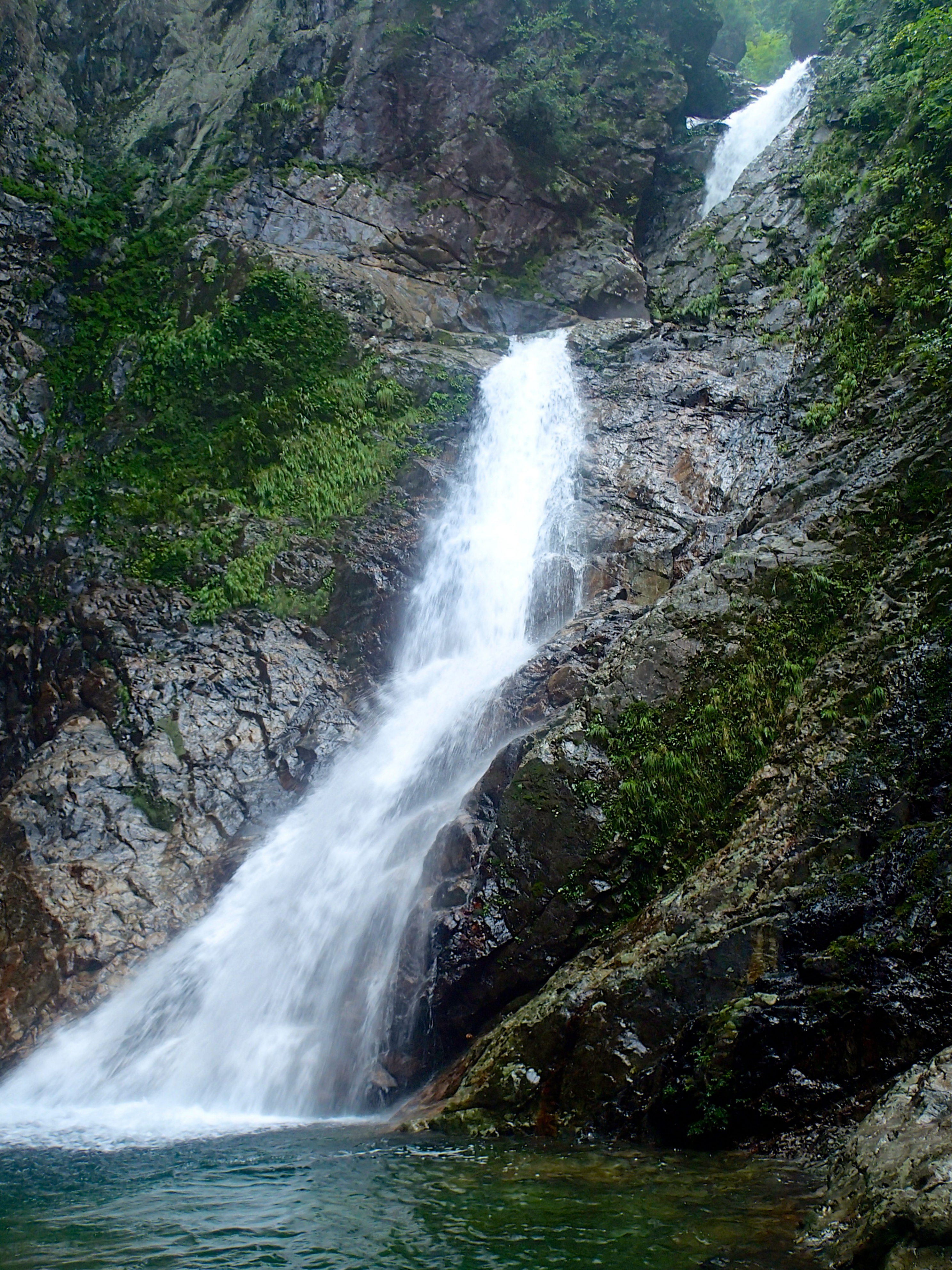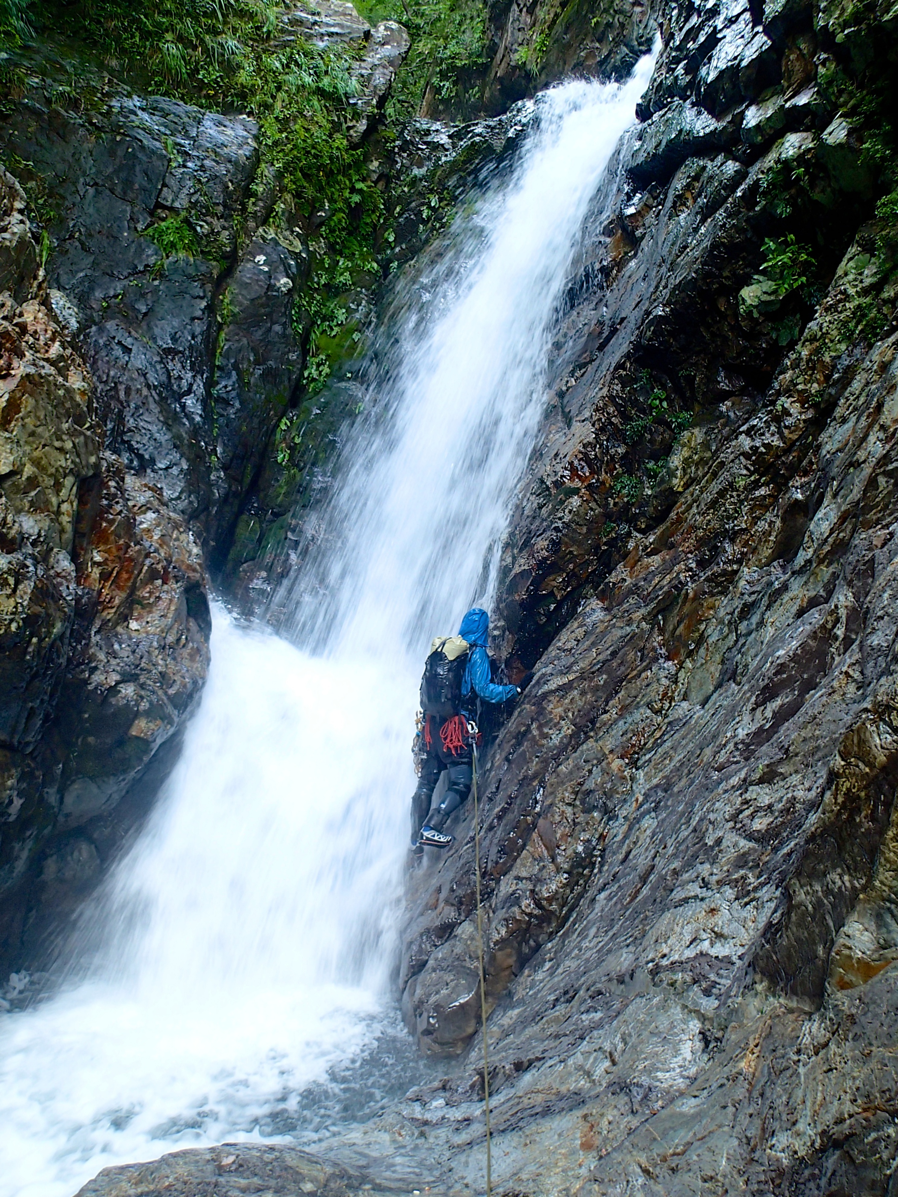 6:15に出発。ここからは怒涛の連瀑帯に突入する。最初の6mと15mは右岸巻き。続く18mは中々の美瀑。直登は困難そうなので左岸から巻くが、結構立っているので一部ロープを使用。その後の10mも末広がりで美しいがやはり直登は厳しいので同時に左岸から巻く。