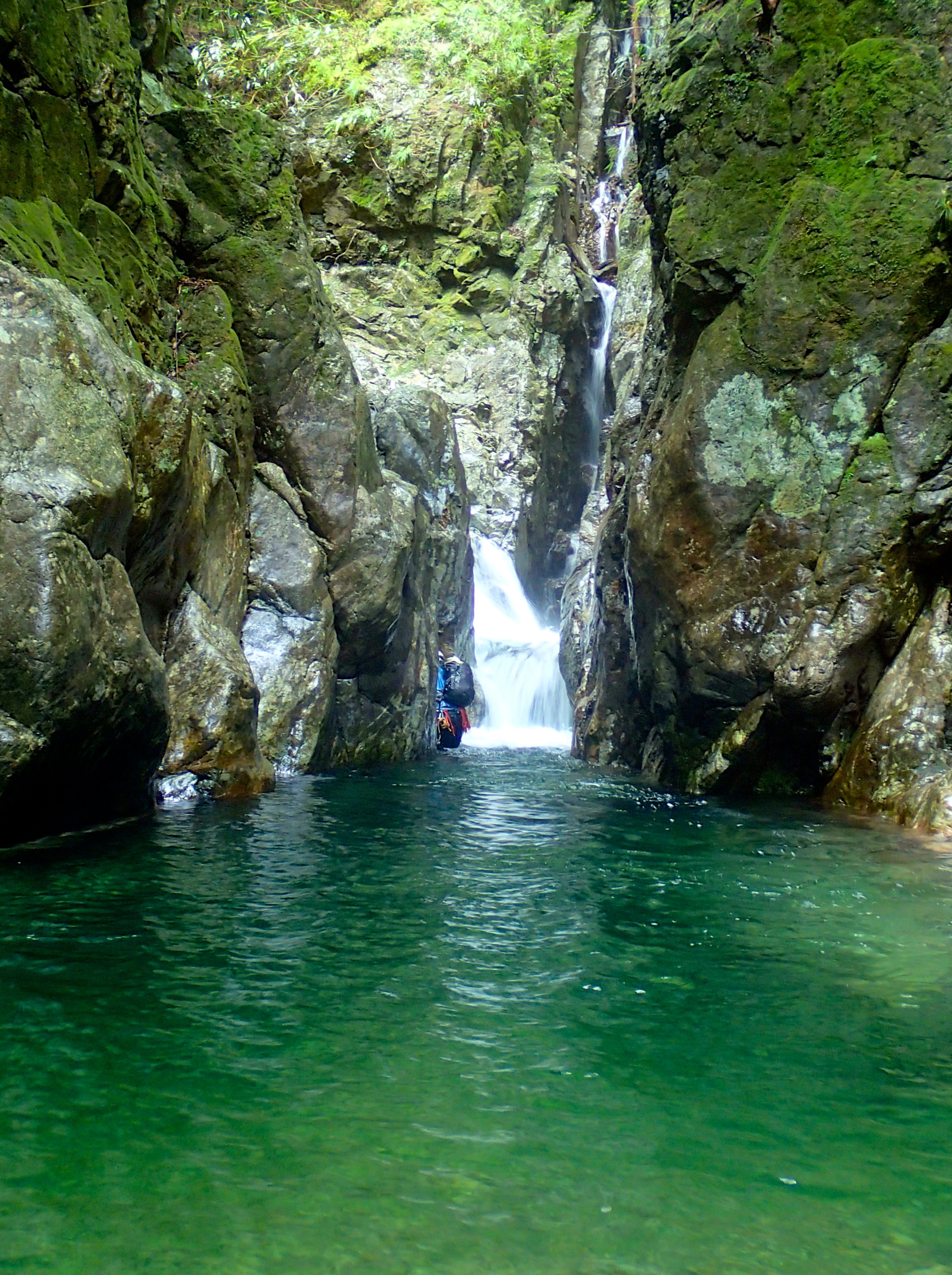 その後、CS×2の先に6m滝がかかるミニゴルジュが登場。普通は巻く様だが頑張って泳いで取り付いてみる。CS×2はツッパリを使って普通に越えられるが、最後の6m滝が水の勢いが強いのとスタンスがないのとで手強い。しかしここでゴルジュ入口に戻って高巻くのも癪なので、水飛沫を浴びながら渾身のクライミングで突破する。