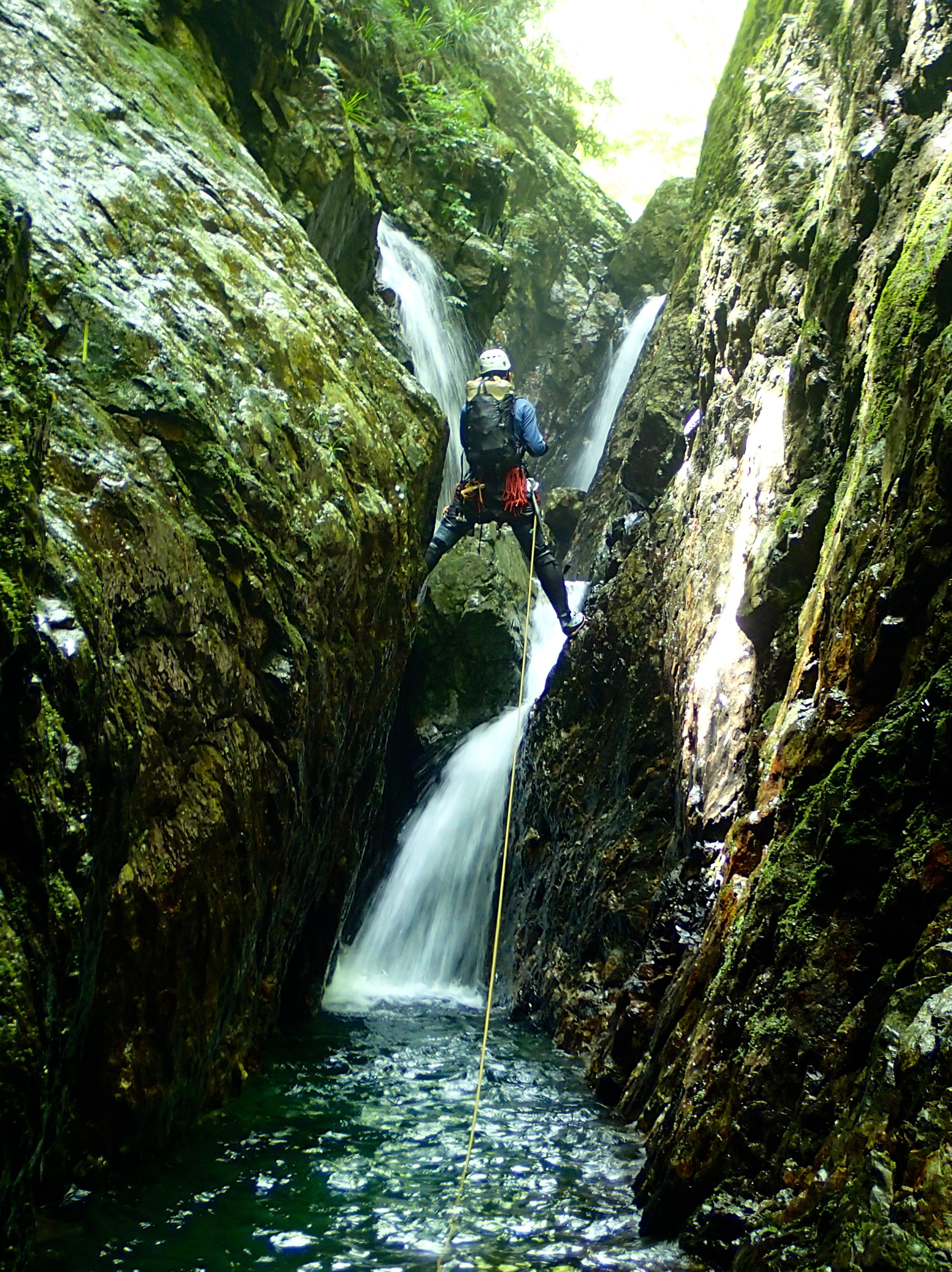 続く20m滝も懸垂で下り、その後のゴルジュ状連瀑帯は右岸から巻き下る。