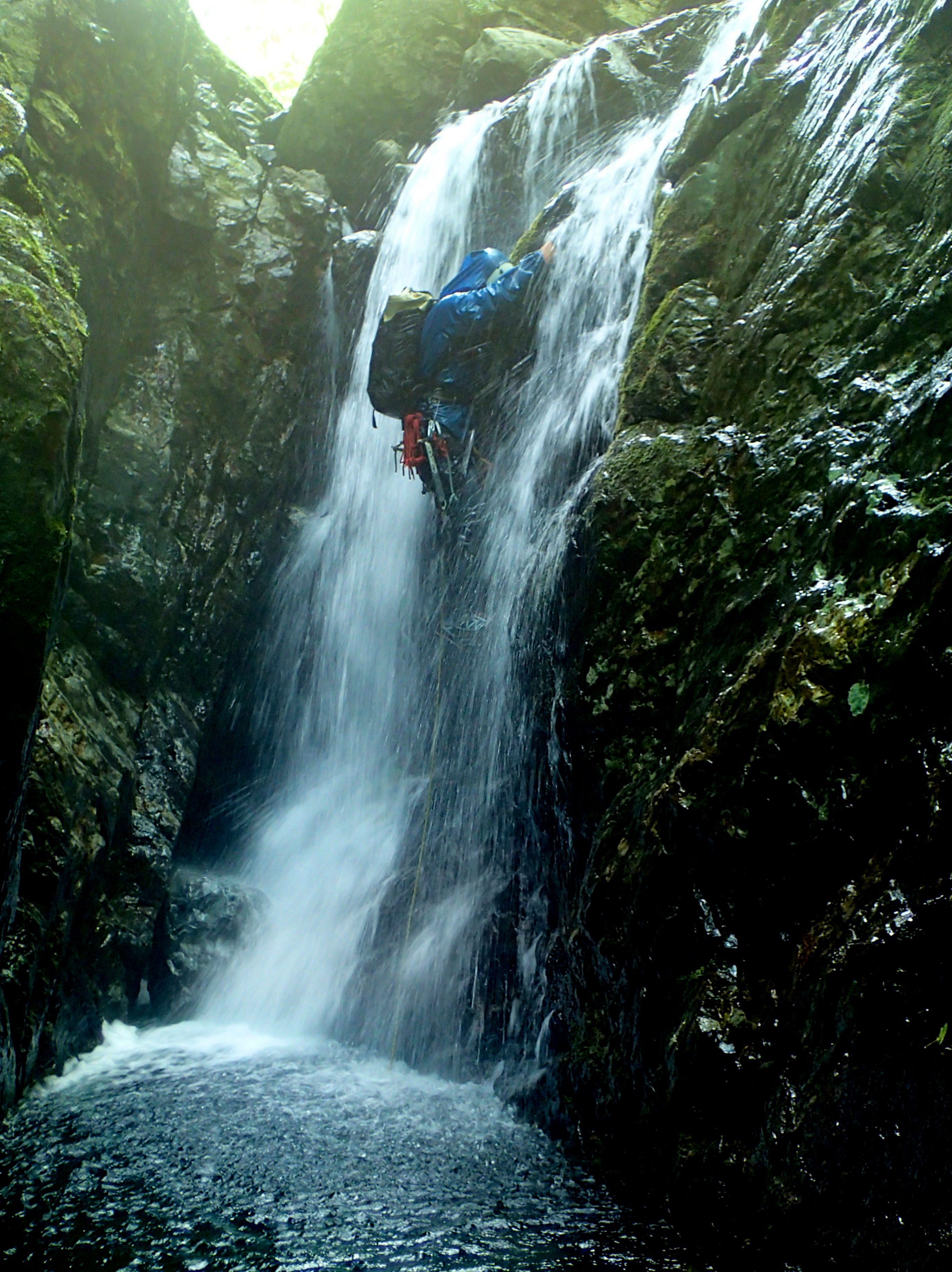 右岸側にトラバースして小尾根を越え、懸垂下降2~3ピッチで裏側のスラブ状ルンぜに降り立つ。下から見ても見事な大滝。この滝はかなり辛めだが人工を交えて登攀もできるとのこと。