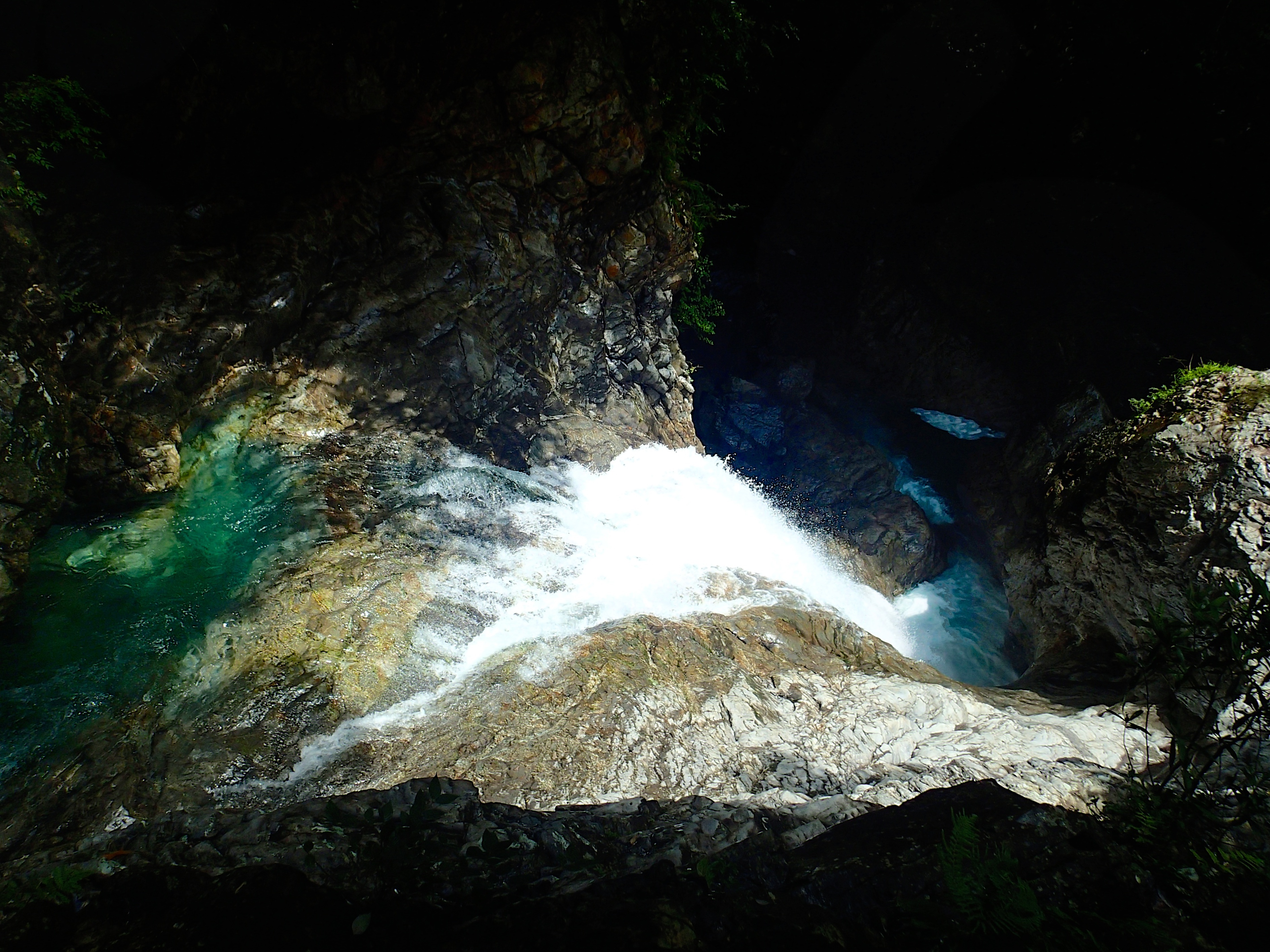 ここは昨日登った岩井谷大滝をも越える高さを誇る八町滝(100m)の落ち口。流れに吸い込まれるような恐ろしさを感じる。