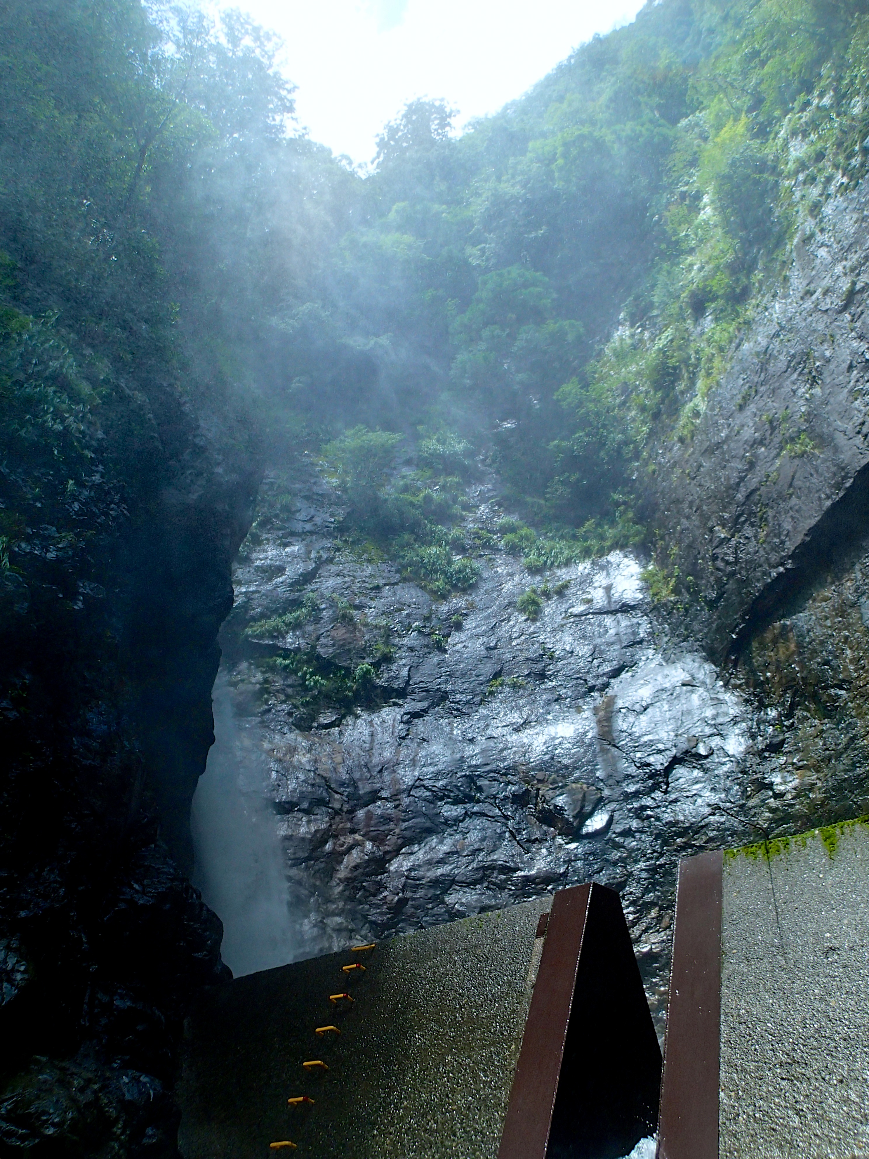 しかし三平滝は大きな釜の向こうで90度左手に折れており、水飛沫を浴びながら堰堤を登らないと全体像が見えない。