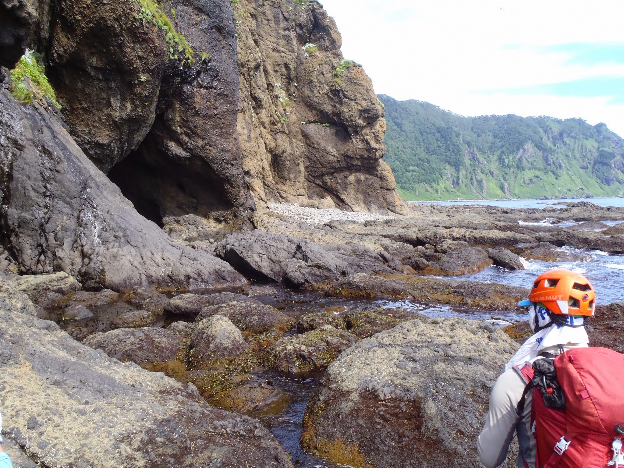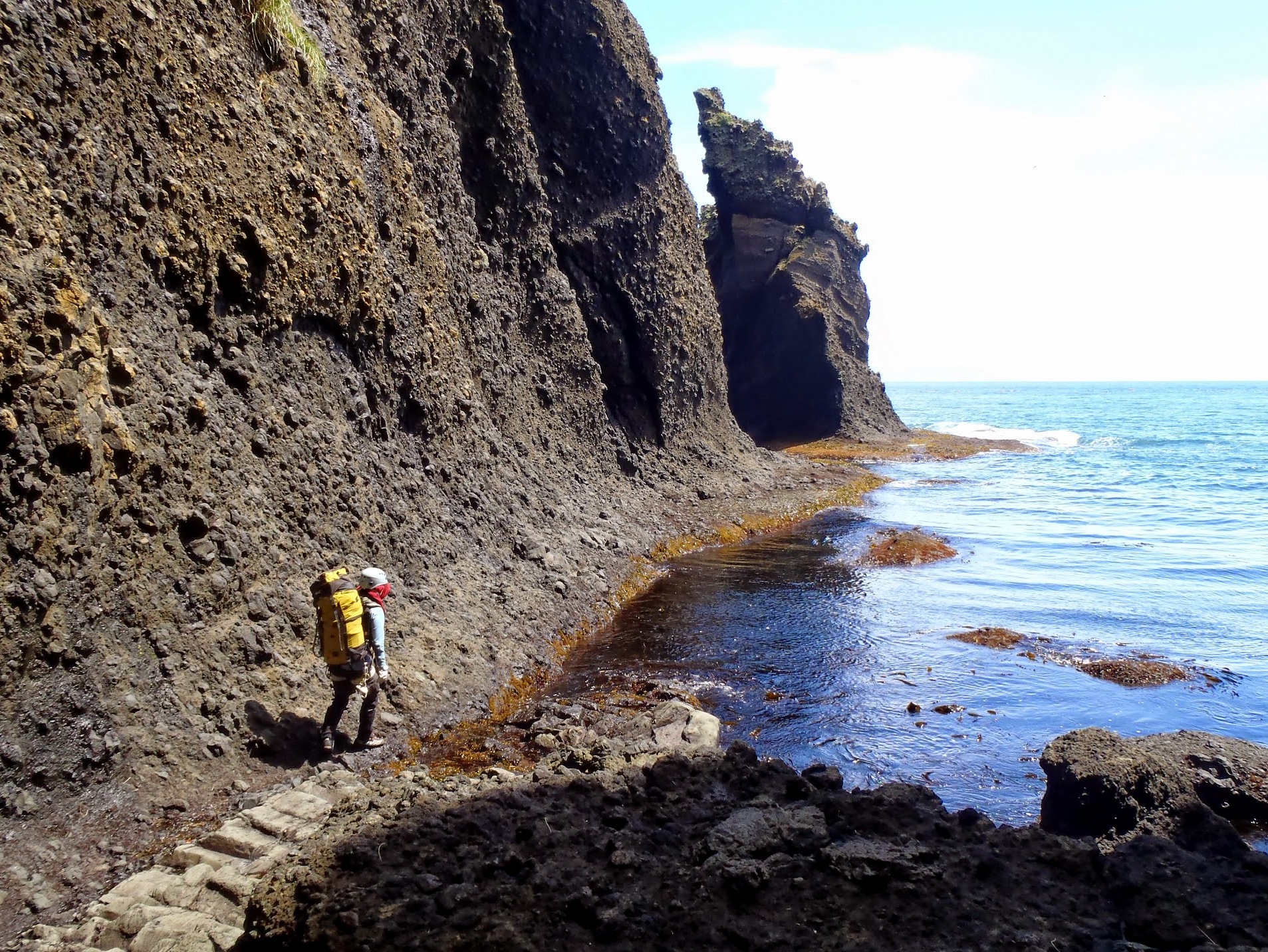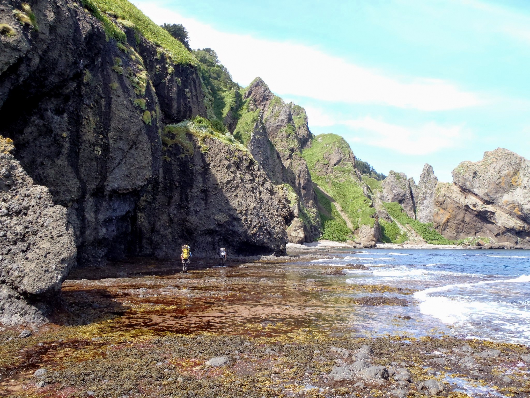 波は思っていたより静かで問題なしだったが、近藤ヶ淵の高巻きラインが薮で消えており予定外の大高巻きで懸垂2ピッチを交えて海岸線へ戻る。
