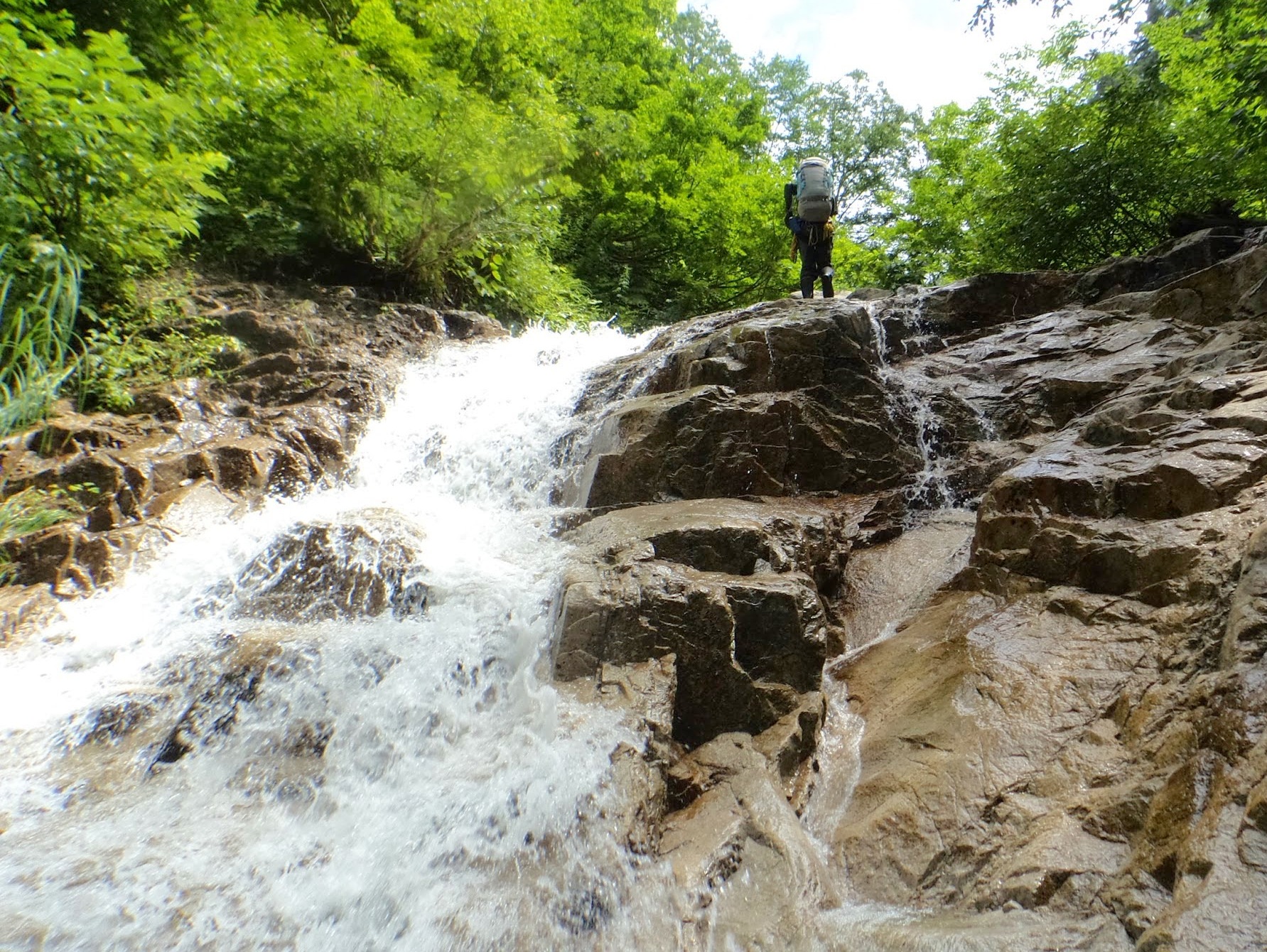 すぐハイ松帯の下降になり、足元が見えずに苦労します。露出している大岩をつないで急な下降を進めると、1800mで2段20mの大滝に出ます。降り口を迷いましたが、ロープは出さず滝上左岸を回り込み、2m程空身でクライムダウン。バンドを下り、流芯を2度渡って滝下まで。結構、気を使いました。