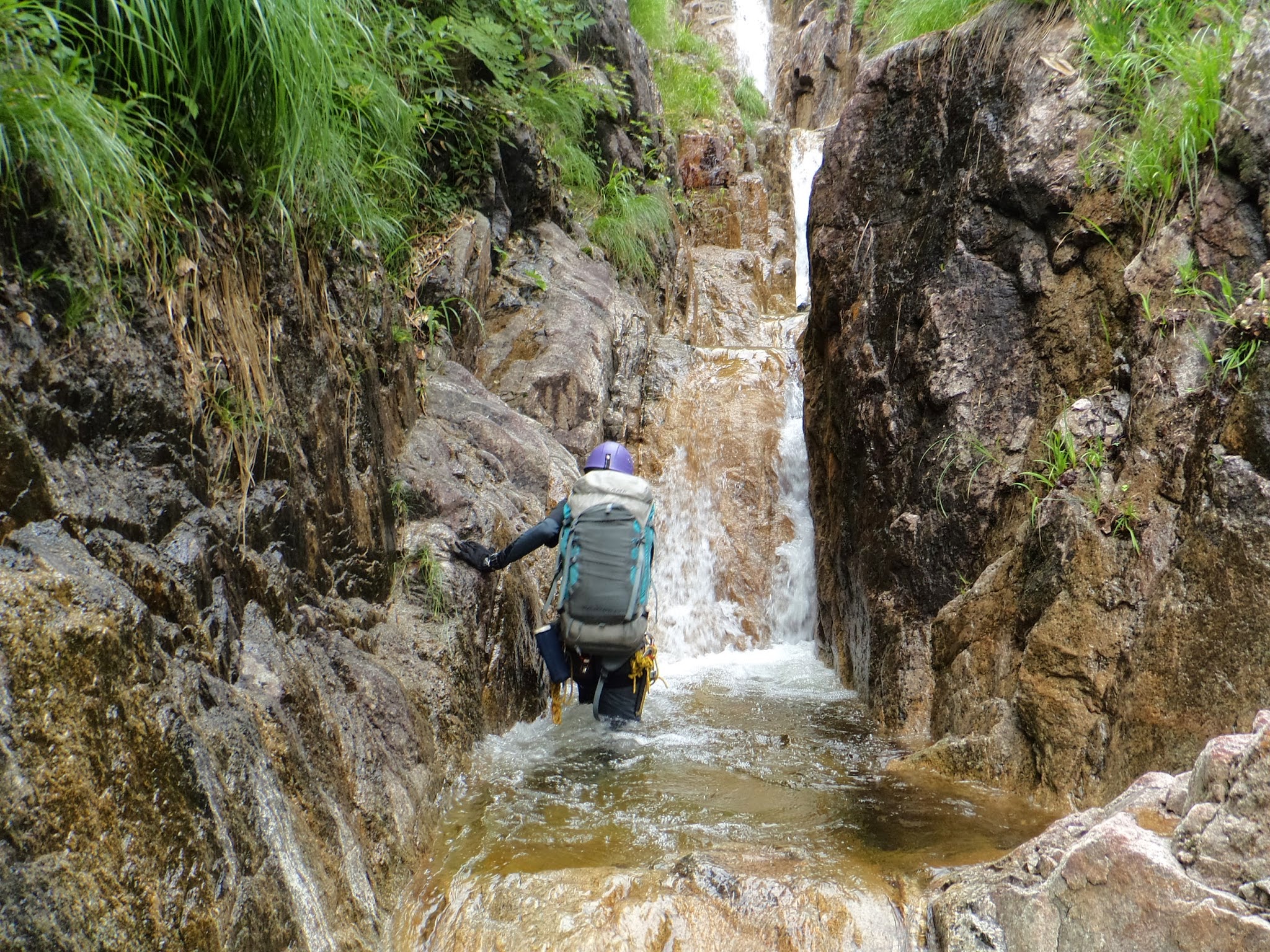 翌日は、いきなりの40m大滝登攀です。このための50mロープ持参です。水流右の乾いた岩をH本がリードします。フェルトで乾いた岩はかえって滑り緊張しました。ハーケン2枚(ブレード1、アングル1)を打ち、残置1枚(ロストアロー)を使って、ロープ40m程でテラスに出ます。