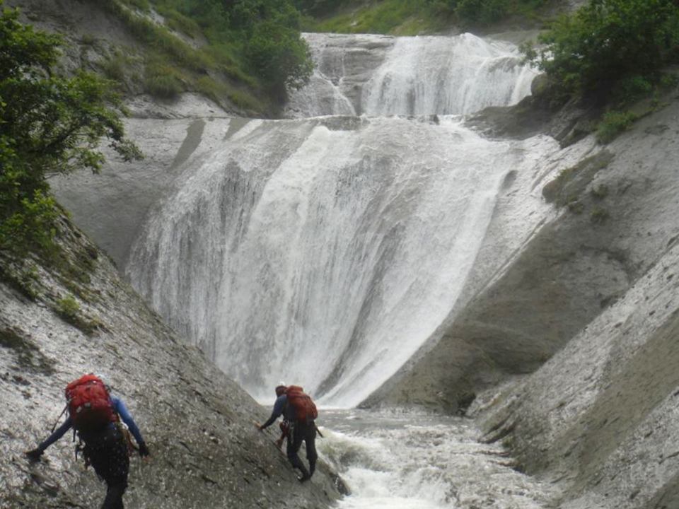 取水口から入渓。水量は多く少し濁っている。最初は巨石帯が続き、右に左に激流と大石を避けながら、渡渉、乗っ越しを繰り返す。30分ほどで二俣に着くと進路を右へ。 ここから渓相はかわり、ゴルジュが始まる。最初の4m滝はロープを引いて泳いで取り付く。寒さから躊躇してしまうが、一度濡れてしまえばあとはジャンジャン泳いだり、ボルダーチックなヘツリをしながら水線突破を楽しむ。