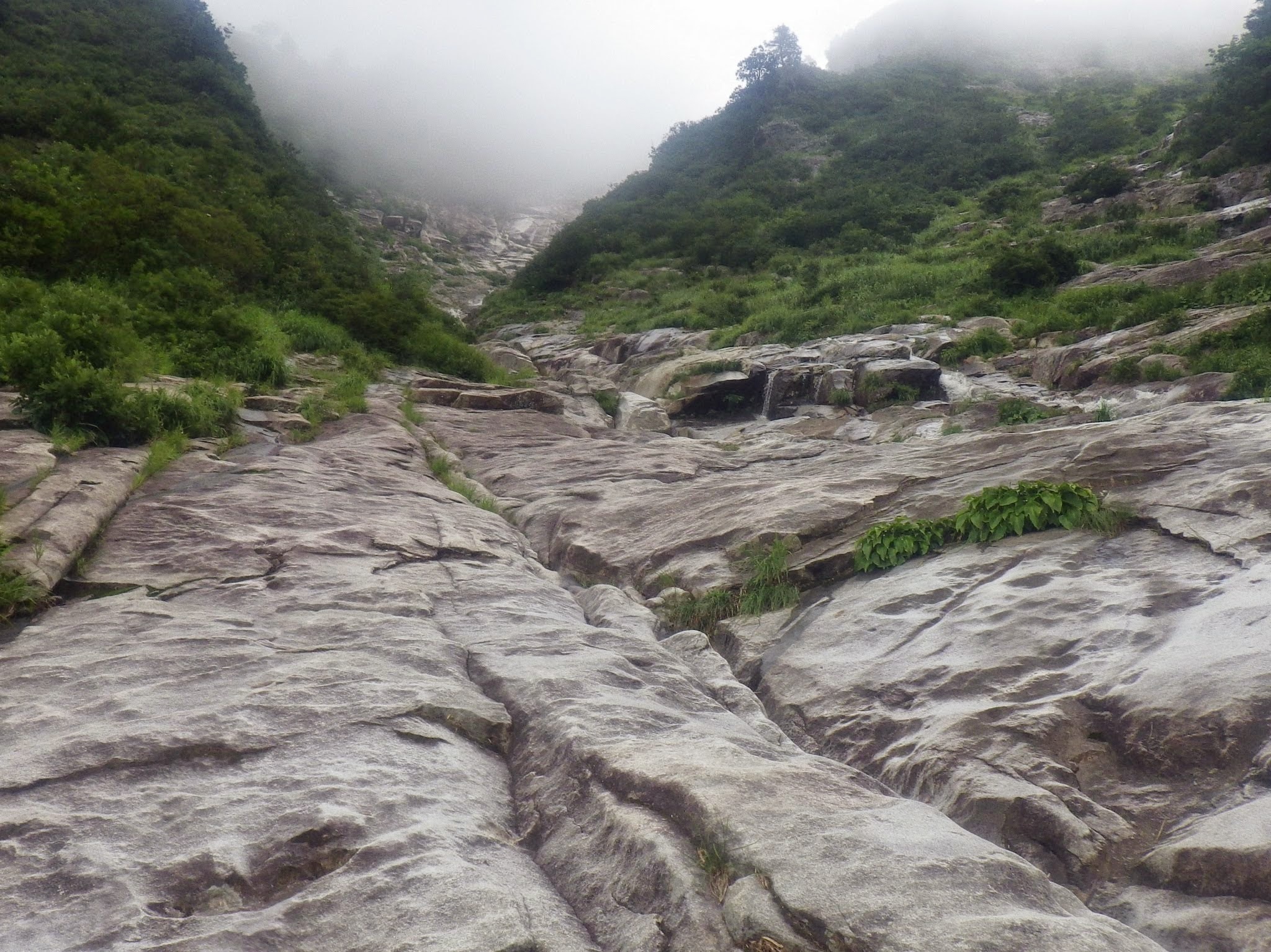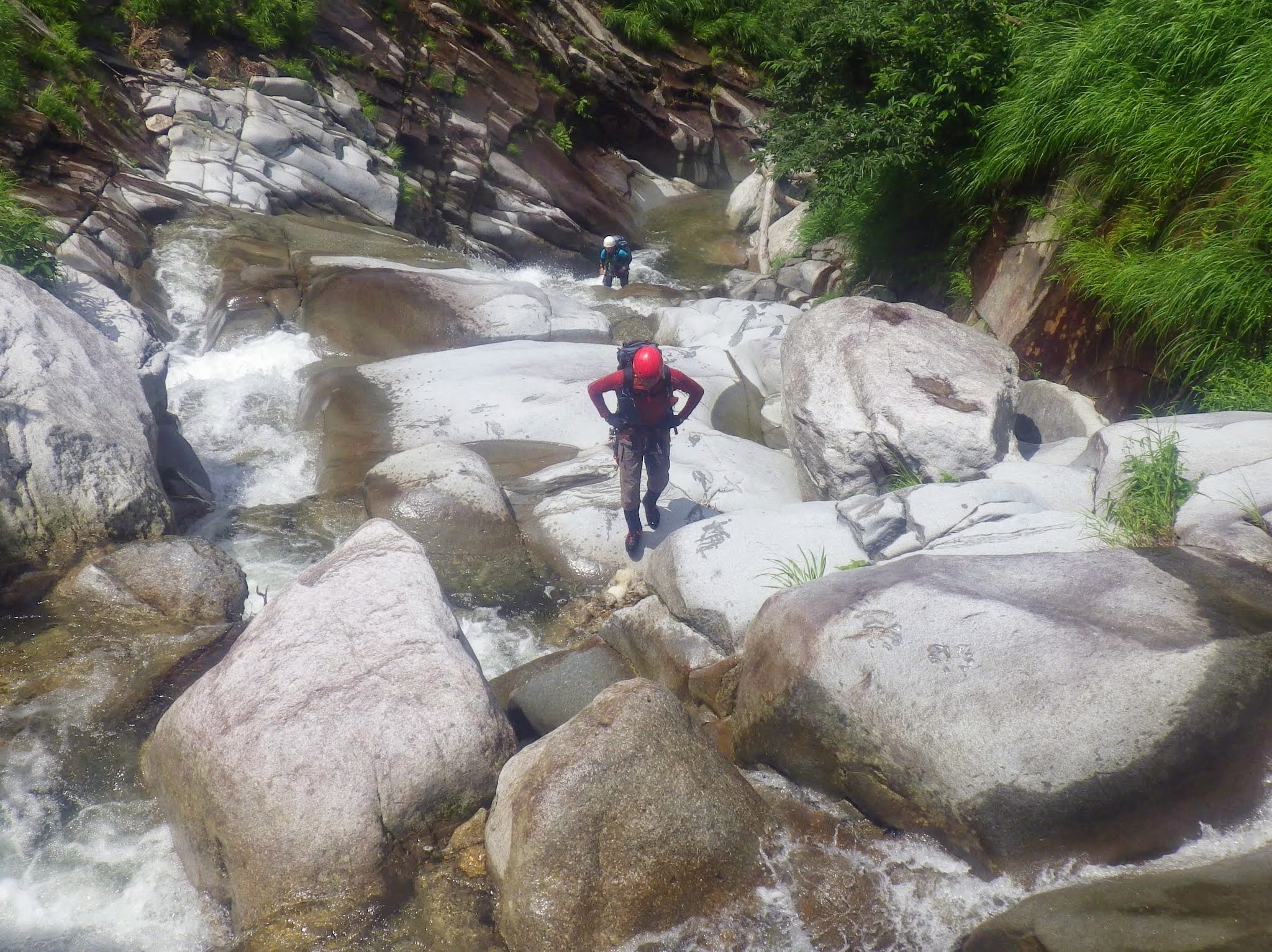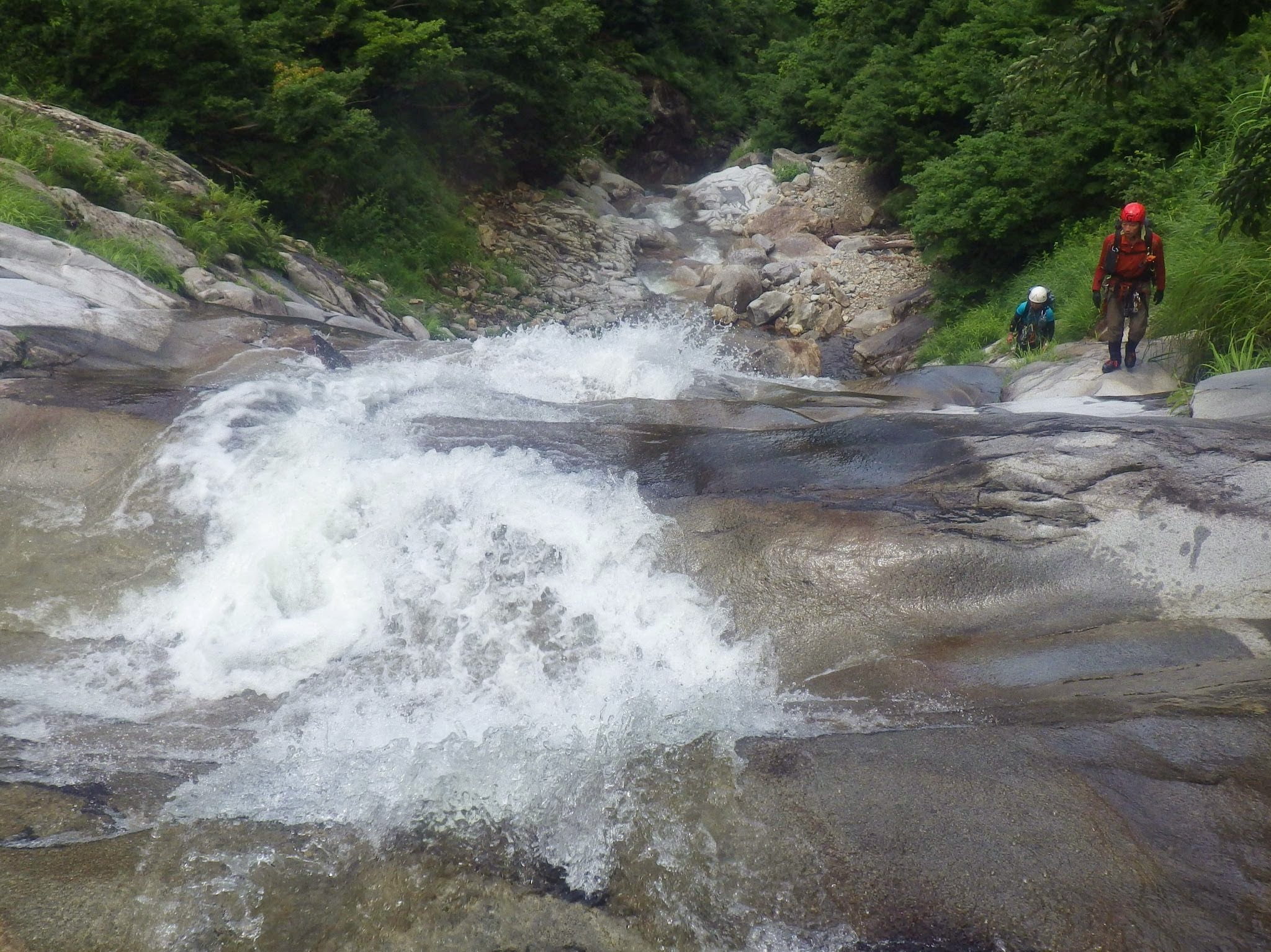 50m大滝を巻き上がった所から渓相はスラブが目立つようになり、まもなくでブログやガイド本に写真が載っている第一スラブの下に着いた。