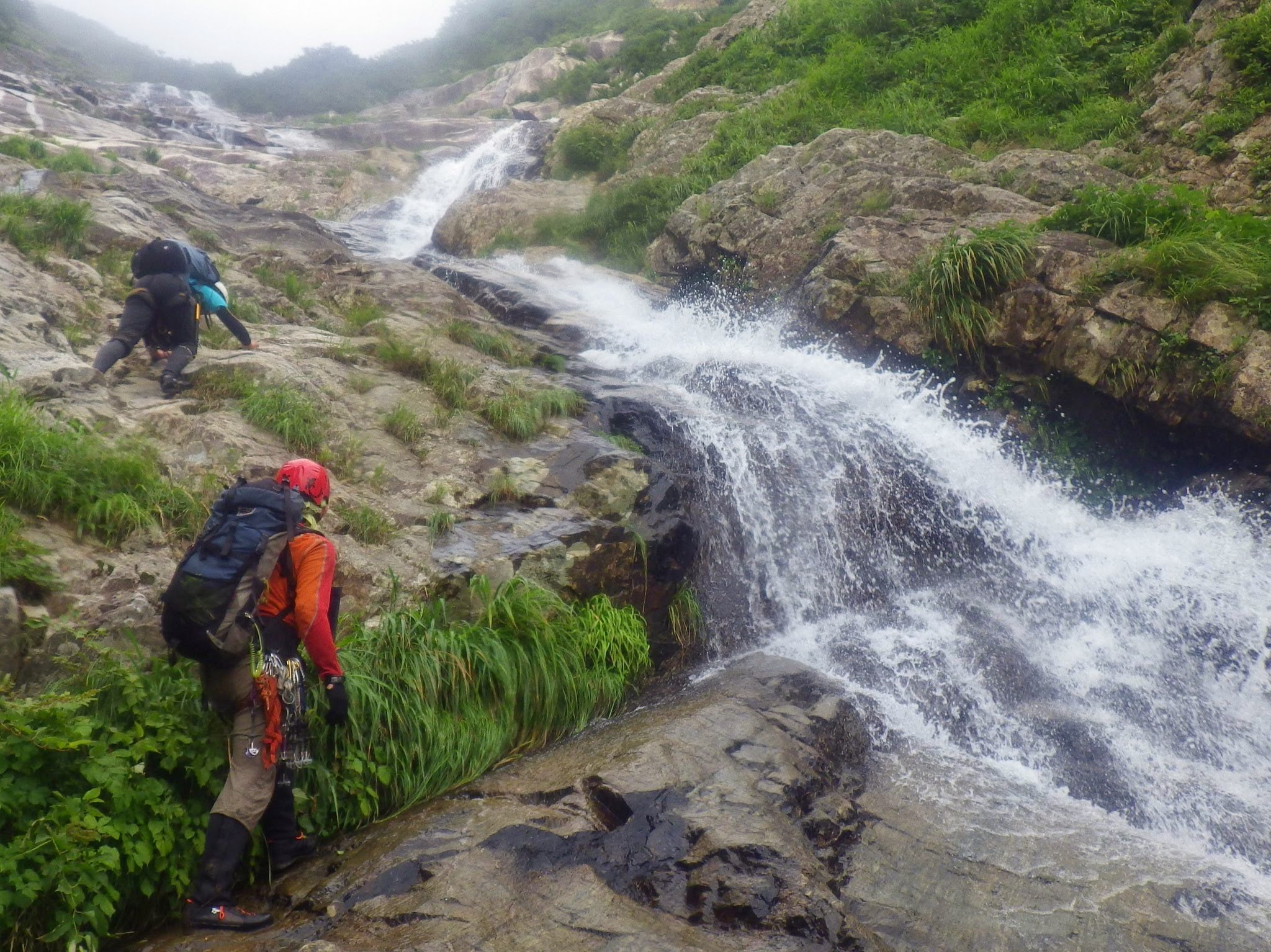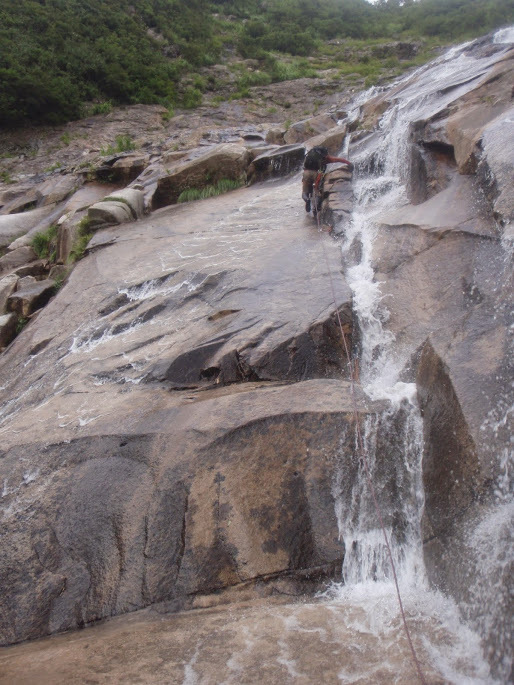以前来た時は右側の水流のクラック状を登ったが、今回は水量多く、Y田君は別ルートを見つけてシャワークライミング!