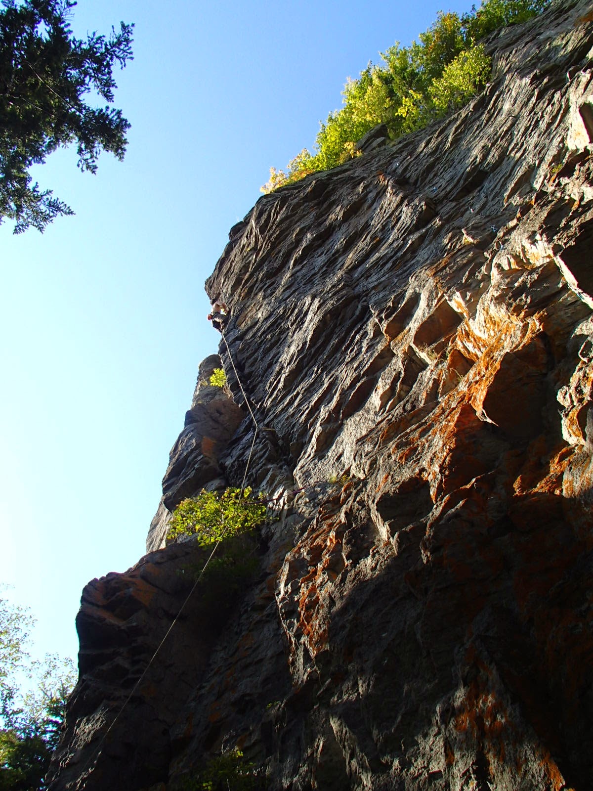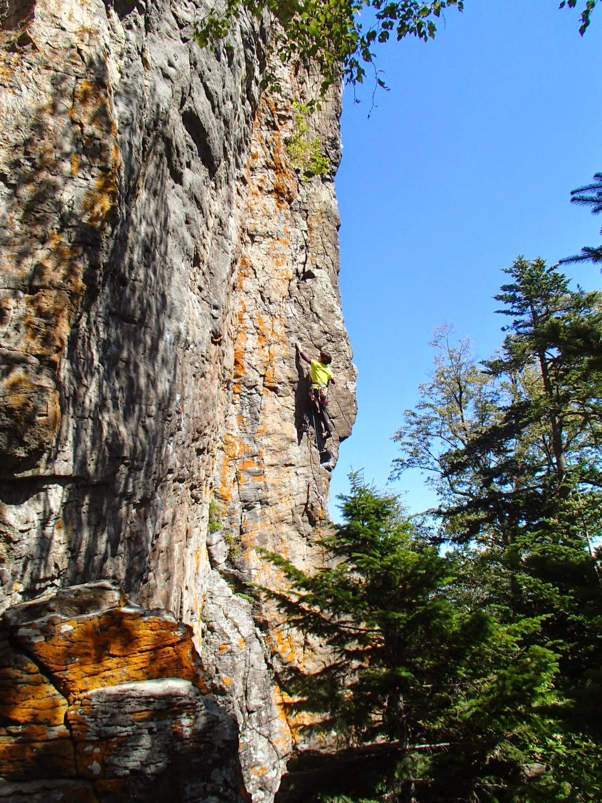 地元クライマーがこの岩場を代表するルートとしてススメていたのが「サンピラー」5.12b/c。後半のかぶったカンテの中盤に核心部がある。
