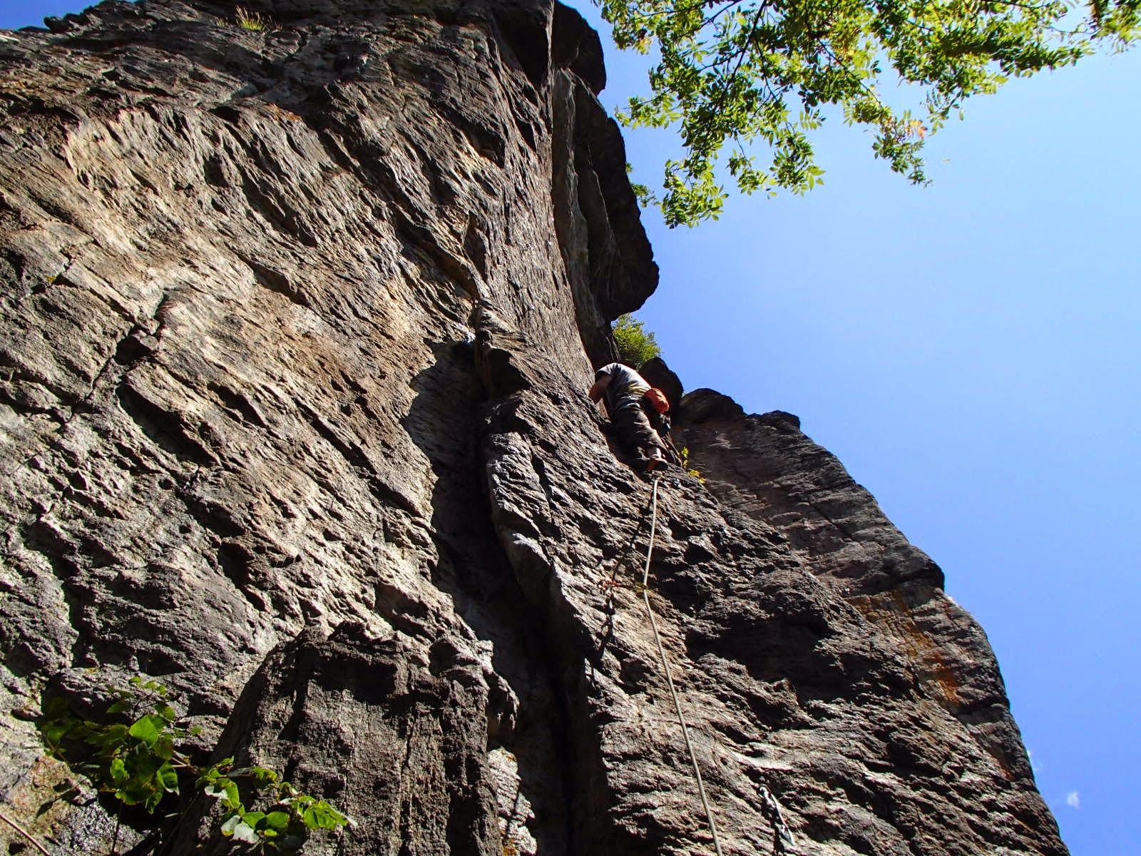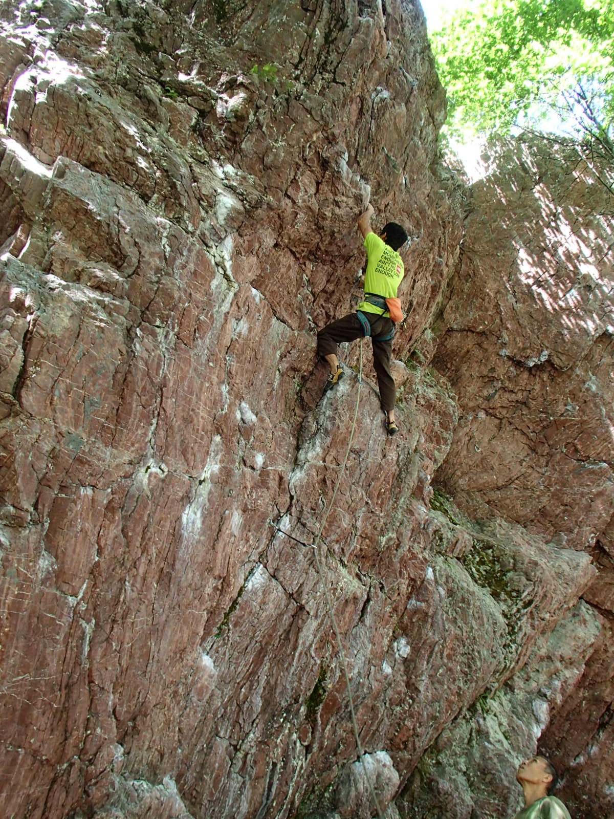岩質は砂岩で、垂壁から薄かぶりくらいのルートが多い。晴れているのは良いのだが、南面する岩壁が陽に照らされて暑い。