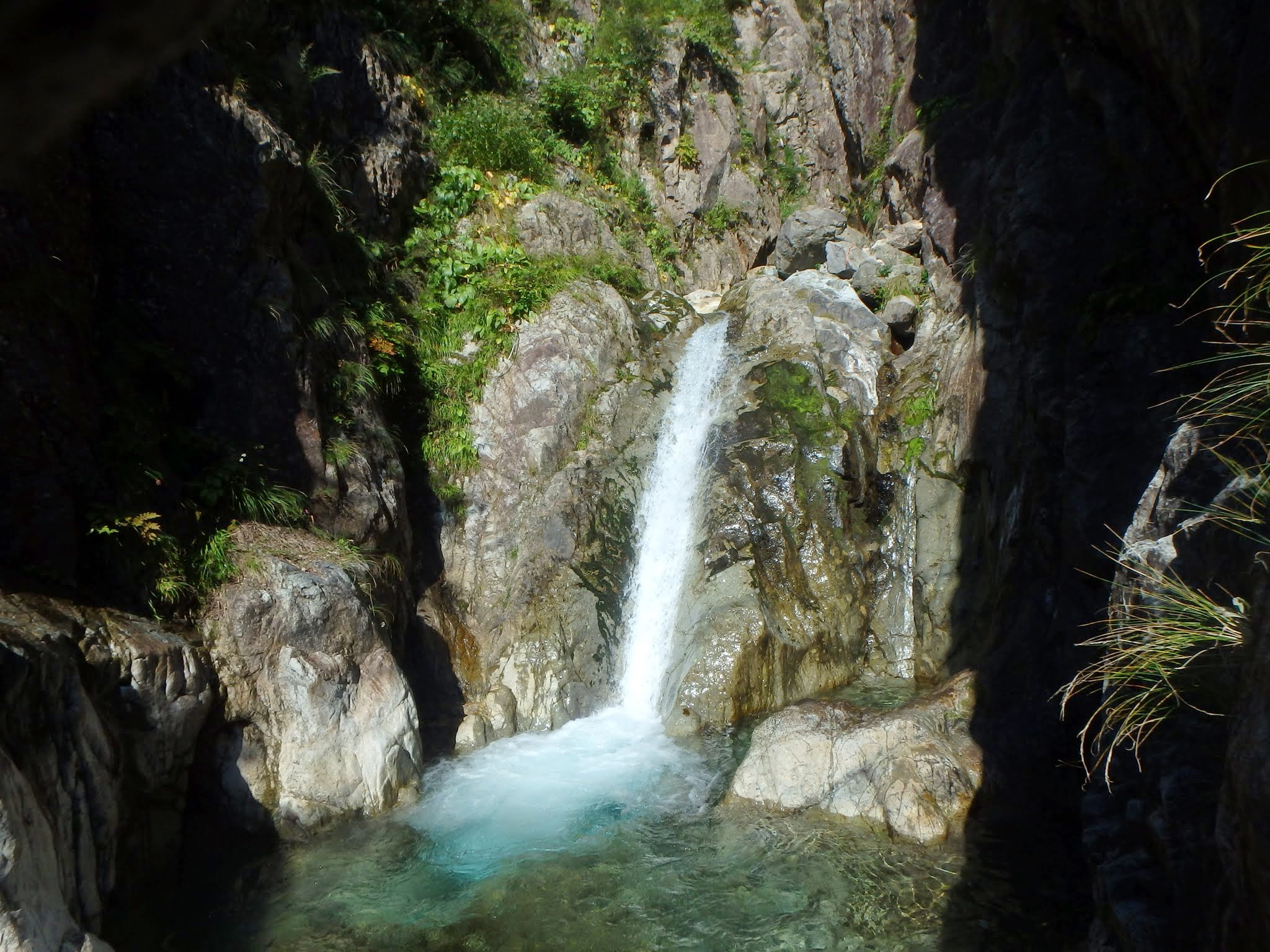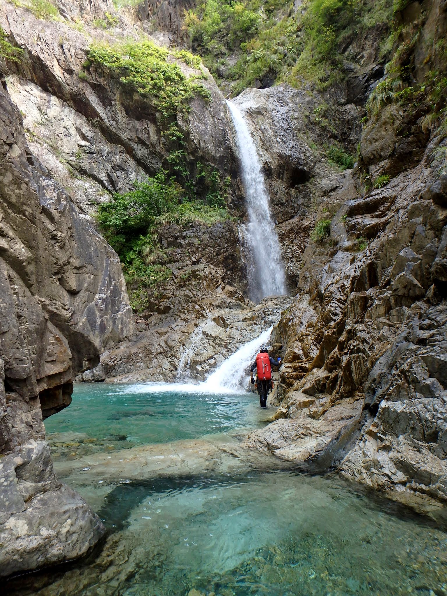 沢は再びゴルジュ帯となり、まずは3段15m滝。フリーで快適に登る。