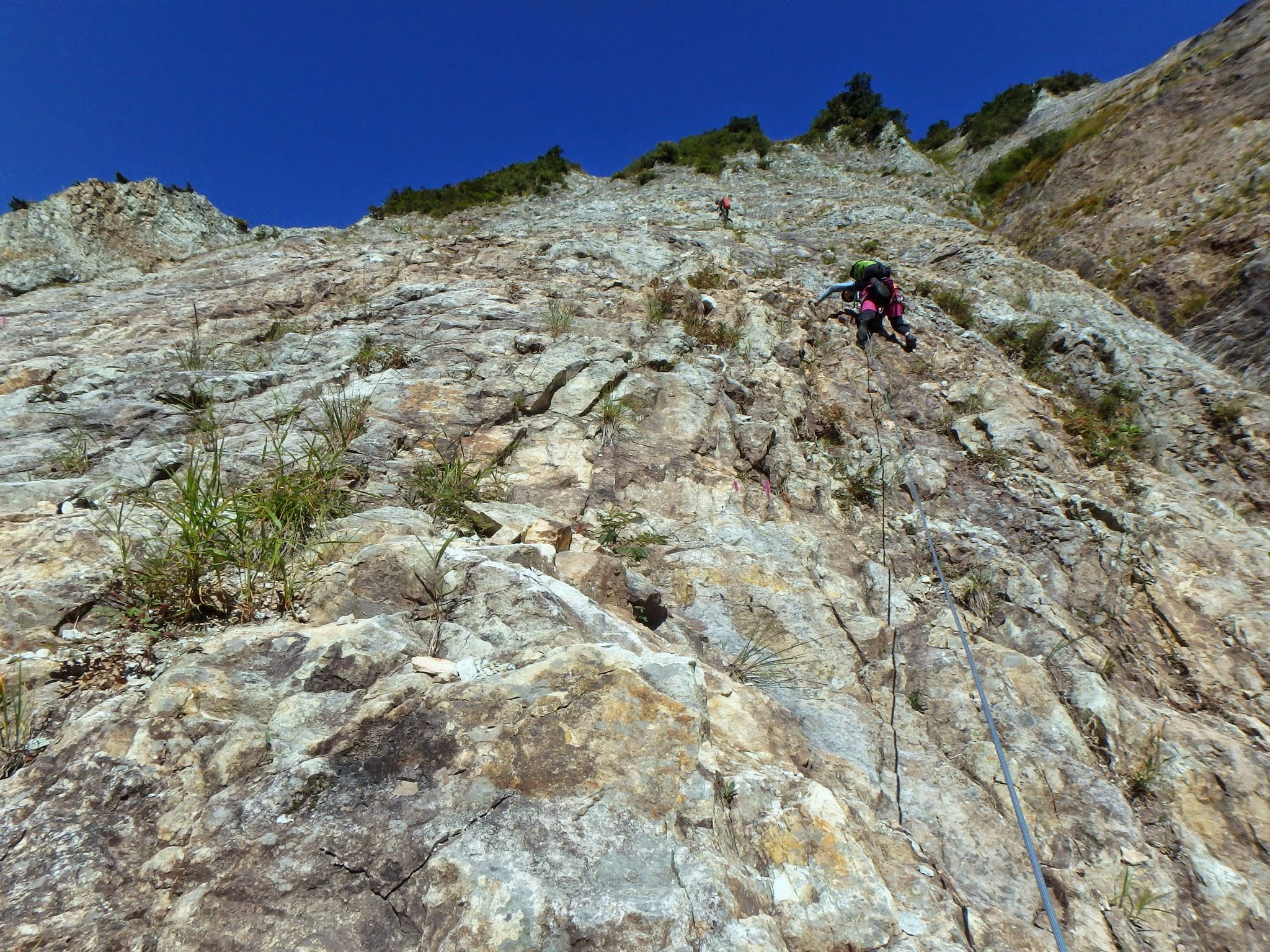 今回は50mロープ×2なので、ロープを二本引いてフォローは同時に登ってもらうことにする。しかし岩が脆くて少し触れるだけでヤバい落石を頻発させるので、後続が先行者のフォールラインに入らない様に注意しなければならない。トップはなるだけ浮石をスイープしながら、やや斜上気味のラインで登る。