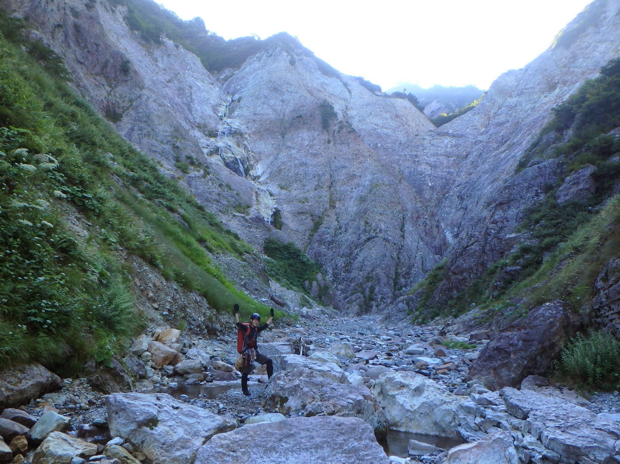 続くCS滝×2は直登できないので左岸のすべる草付を登り、残置支点から斜め懸垂。ここから怒涛の連瀑帯が始まる。