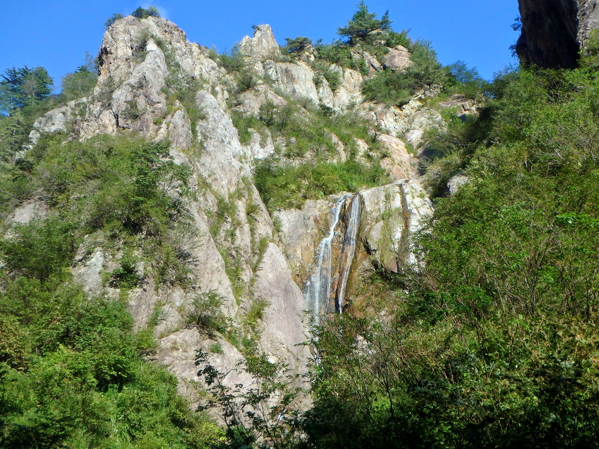 40mナメ滝をロープを出して登ると、やがて右手の稜線が低くなるので五分程度の藪漕ぎで開津谷への乗越地点に到着。奥の二俣までは少々渋いが、そこから先はただのゴーロ帯。上部に広がる仙人壁の景観が素晴らしい。