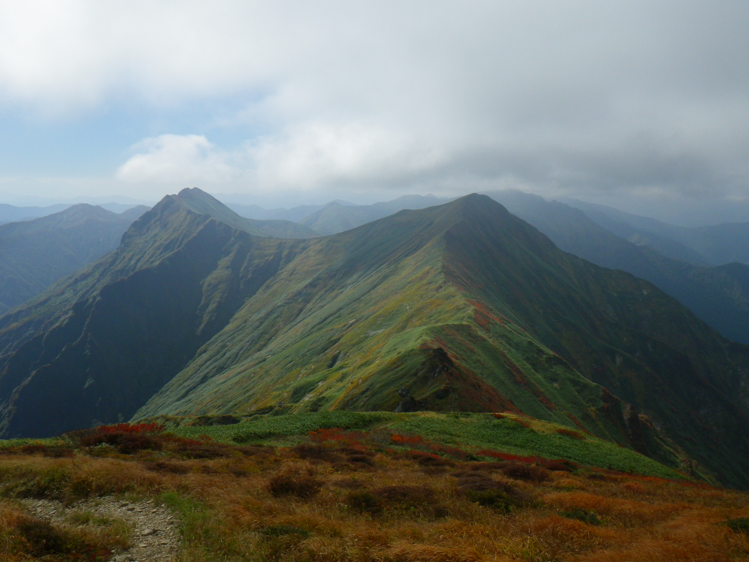 尾根が高いので、朝、歩き出しは周り暗いわけですよ。見上げると輝く谷川南面、