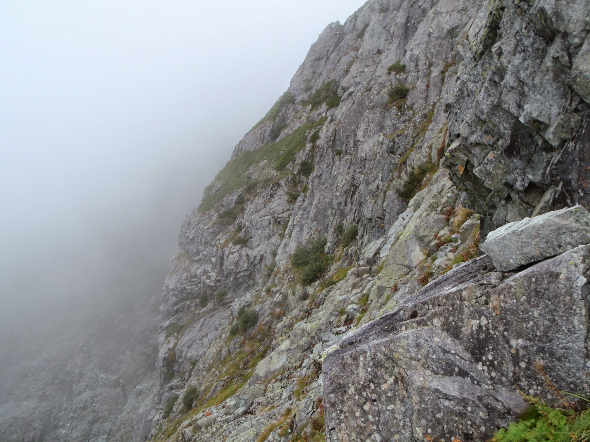 ロープしまって、そのまま右まきで北尾根縦走路へ。一ヶ所30メートル懸垂あり。5/6のコルからまたまたガレ場を下る。4峰正面壁を上にみるトラバースで迷う。ここはK谷さんが下のほうの赤布見つけてくれた。