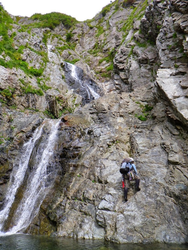 2段12m滝は右岸のバンド状を巻いた。とりついたら脆くて思いのほか悪く、お助け紐で一段上がり、その後1Pトラバース(M中リード)、クライムダウンで沢床へ。左岸巻きの方が良かったかも。