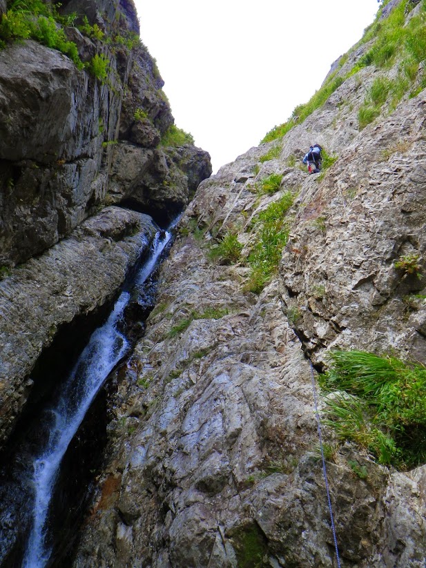 9:20 3m6mジグザグ滝。3mは直登し6mを左壁からいこうとしたらどんどん高巻きに。危険なので途中からロープ出す。草付きを2P(K池リード)し、懸垂で戻る。10:25終了。
