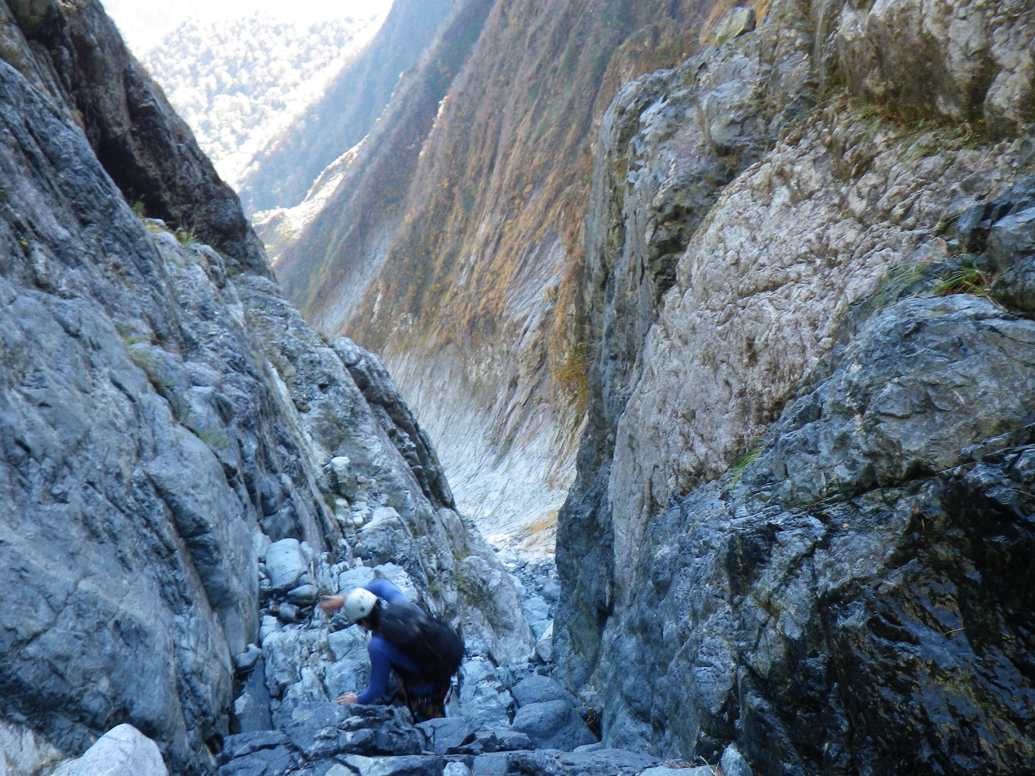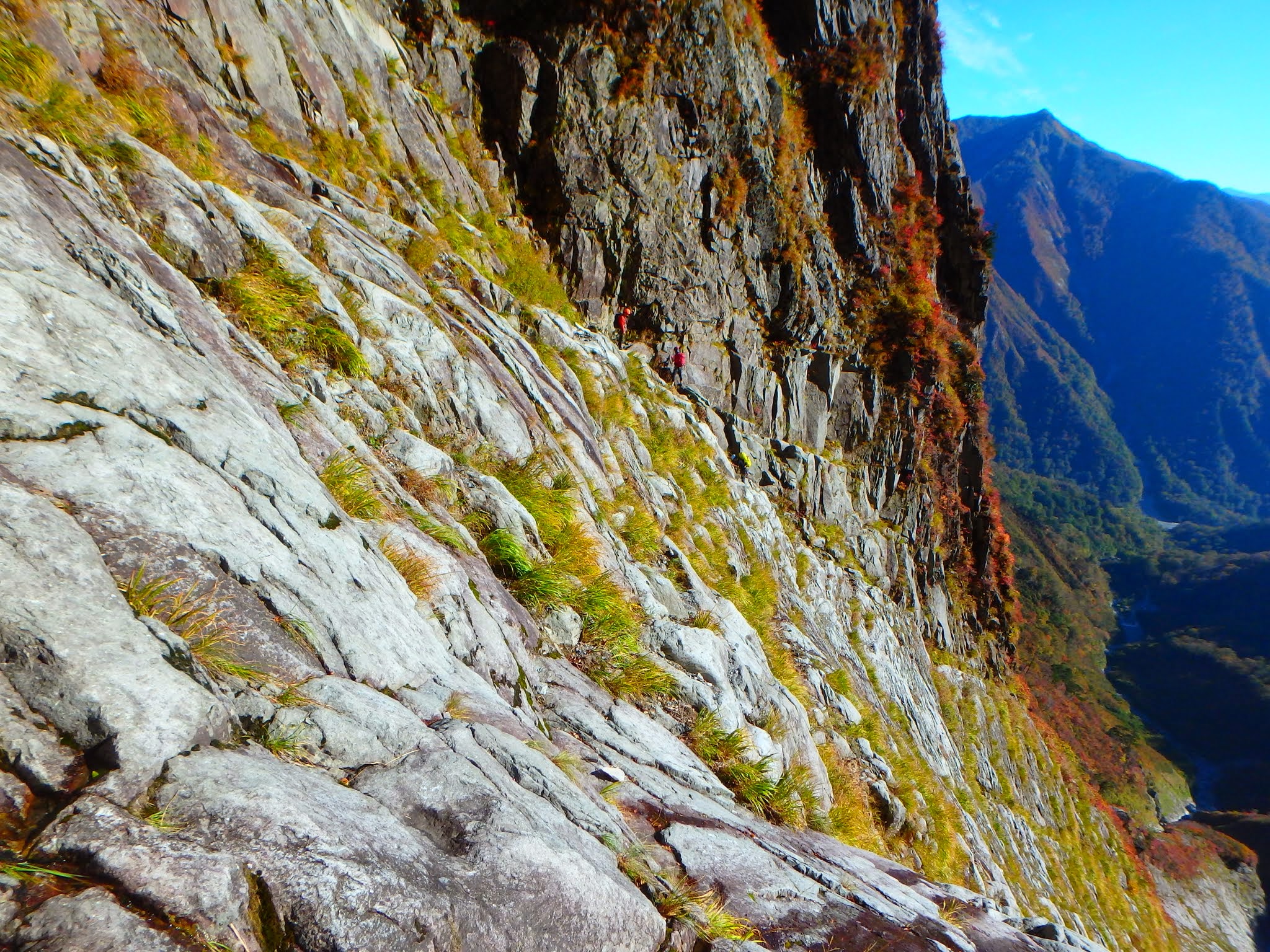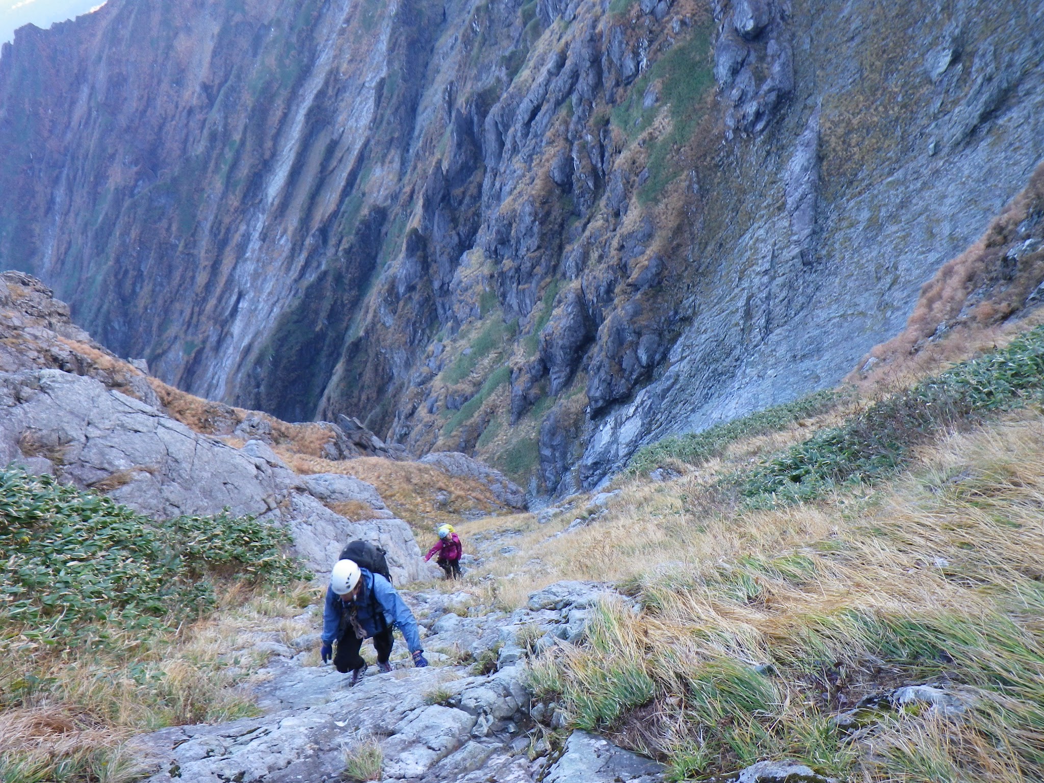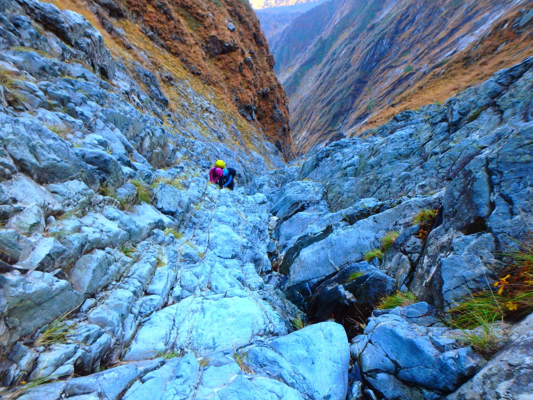 南稜テラスからのトラバースはFIXロープもあるが、落ちたらアウトな崖なので念の為ロープを出して本谷へ。この辺は過去の崩壊による落岩が一帯に堆積している。