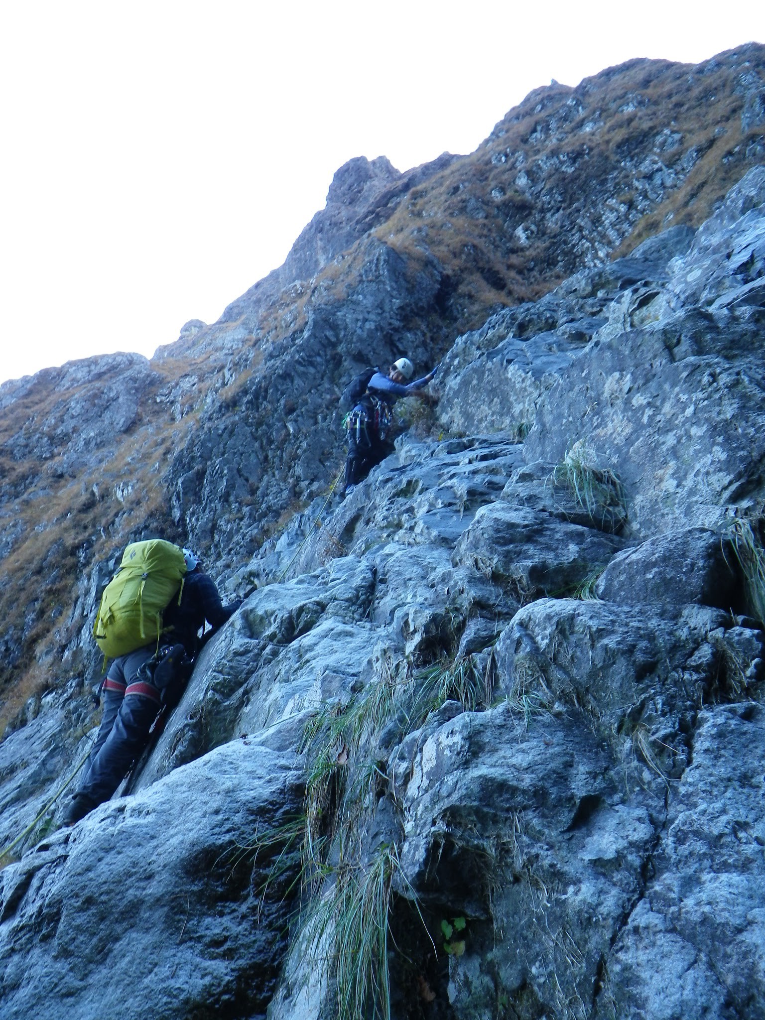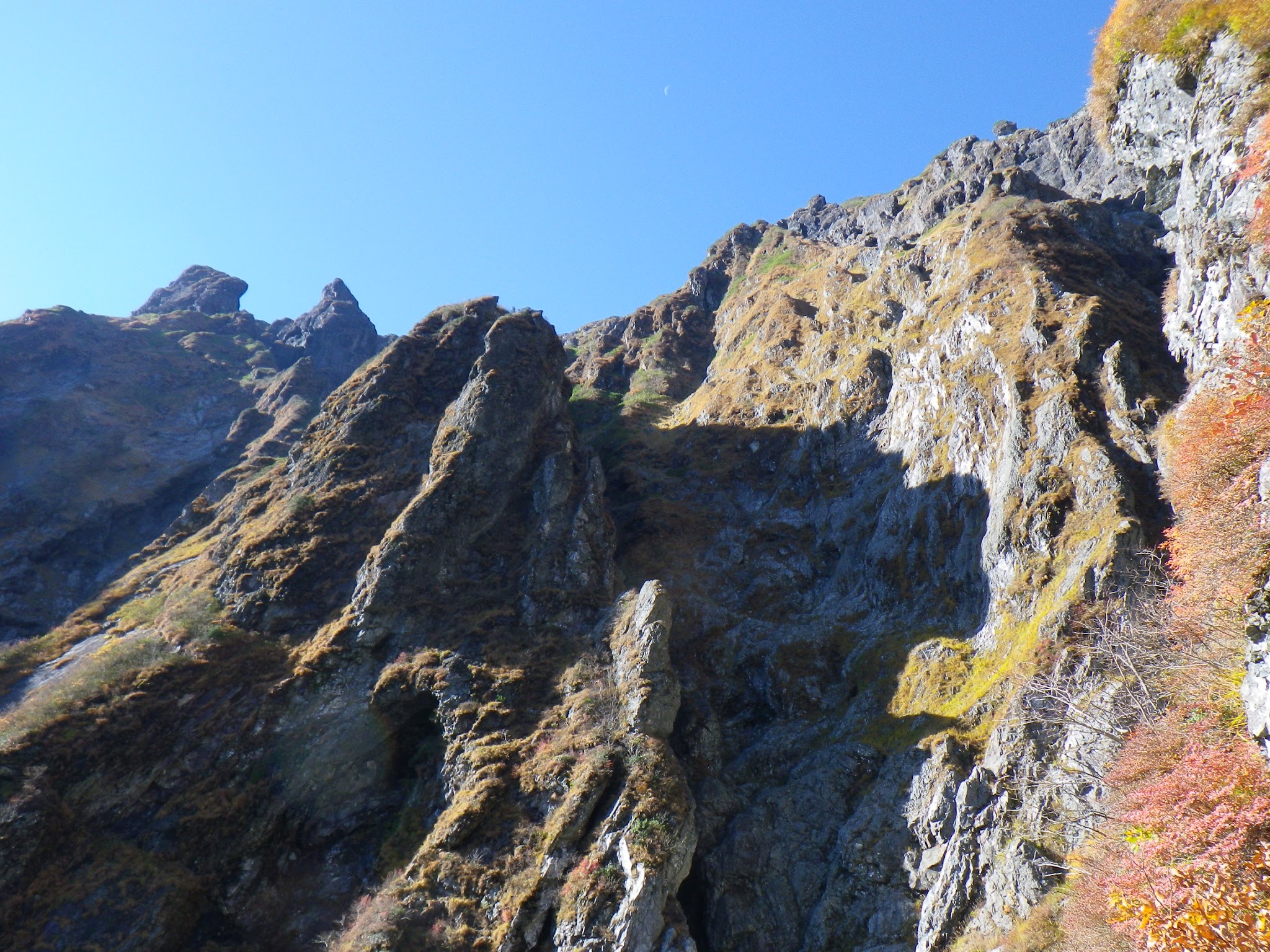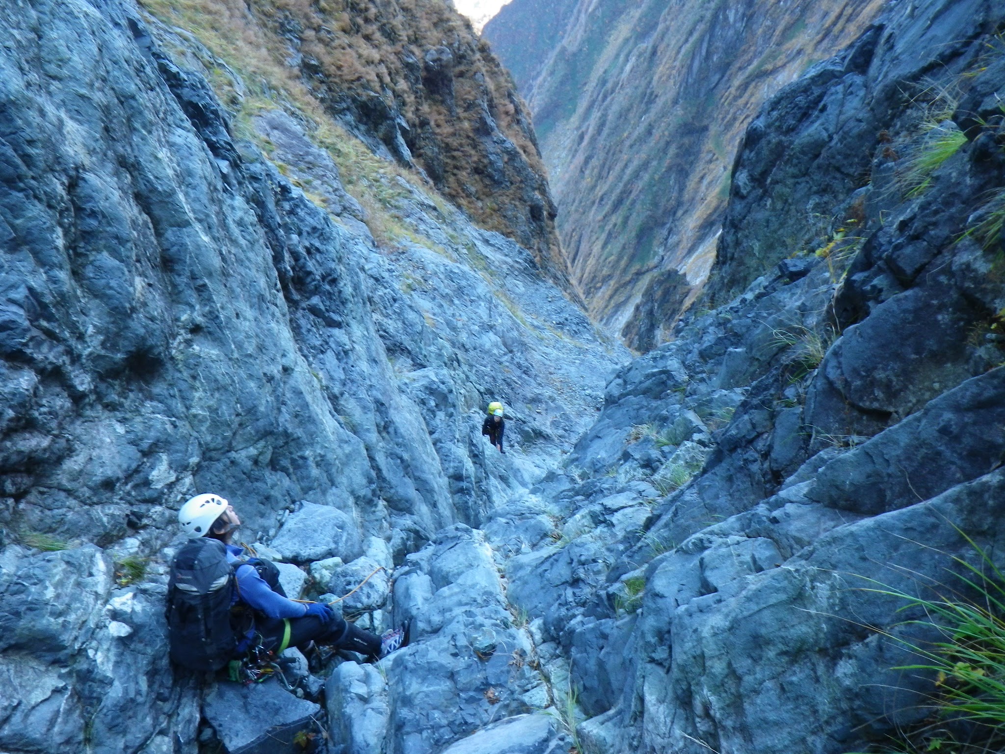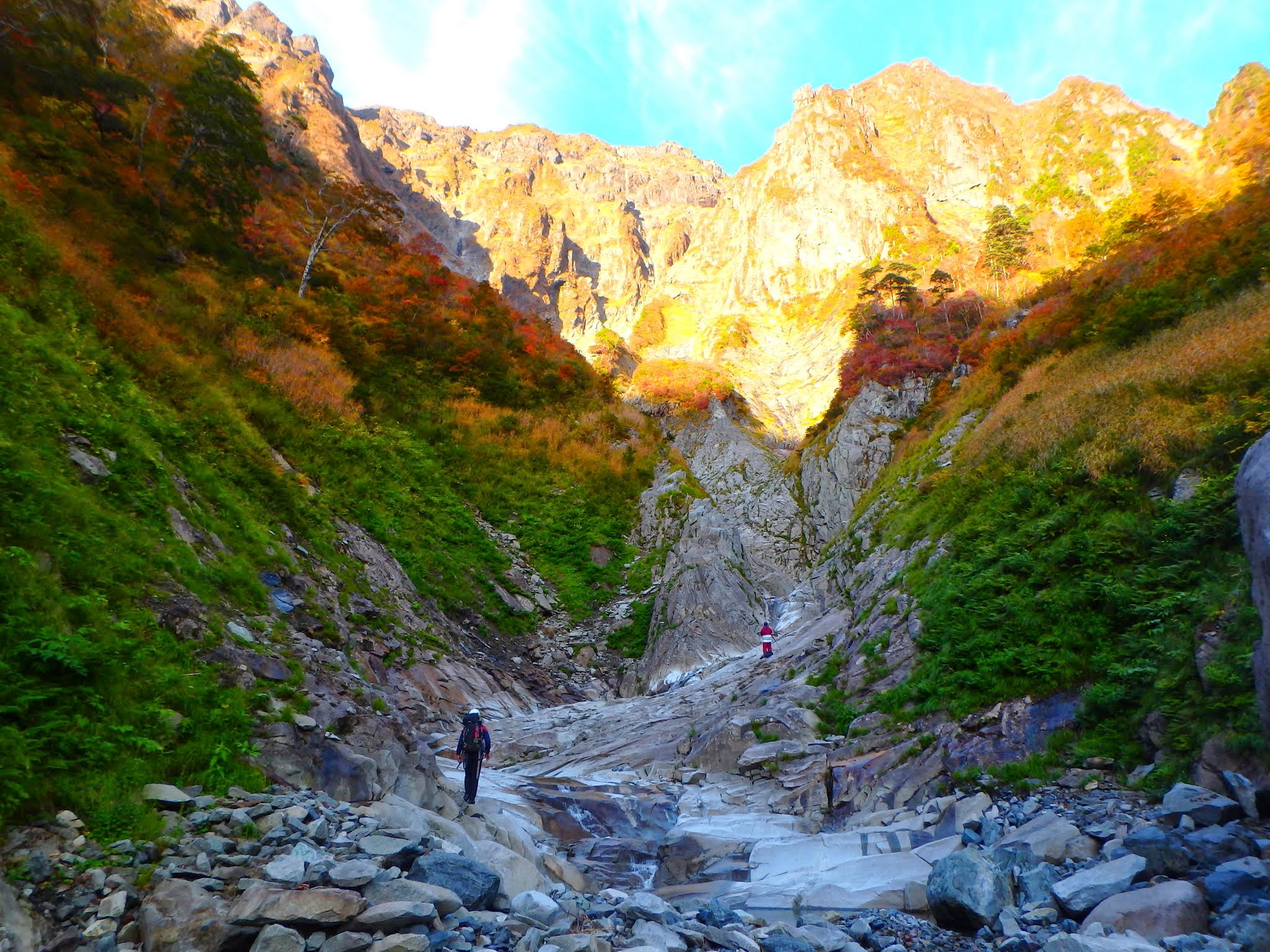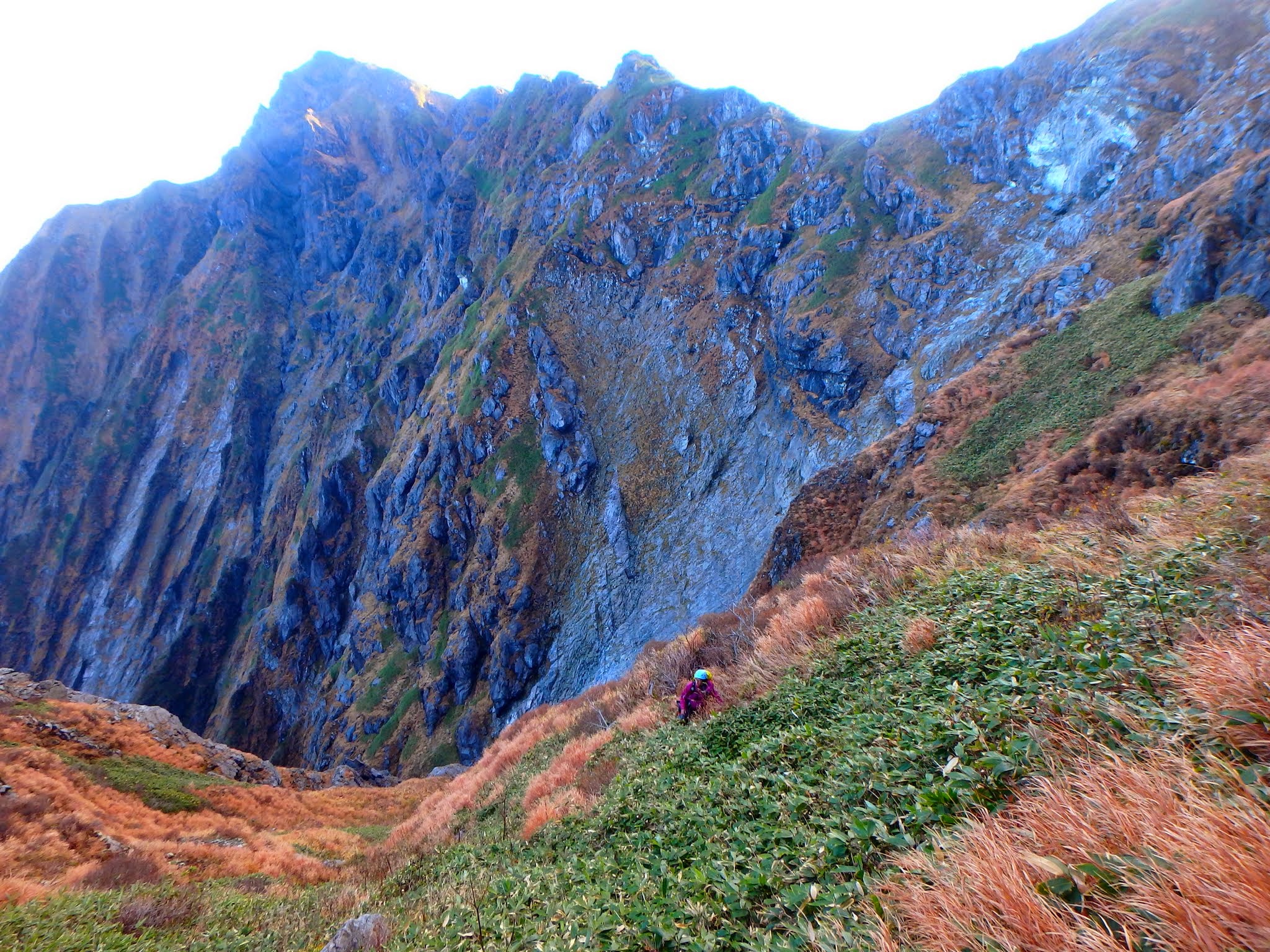 南稜テラスからのトラバースはFIXロープもあるが、落ちたらアウトな崖なので念の為ロープを出して本谷へ。この辺は過去の崩壊による落岩が一帯に堆積している。