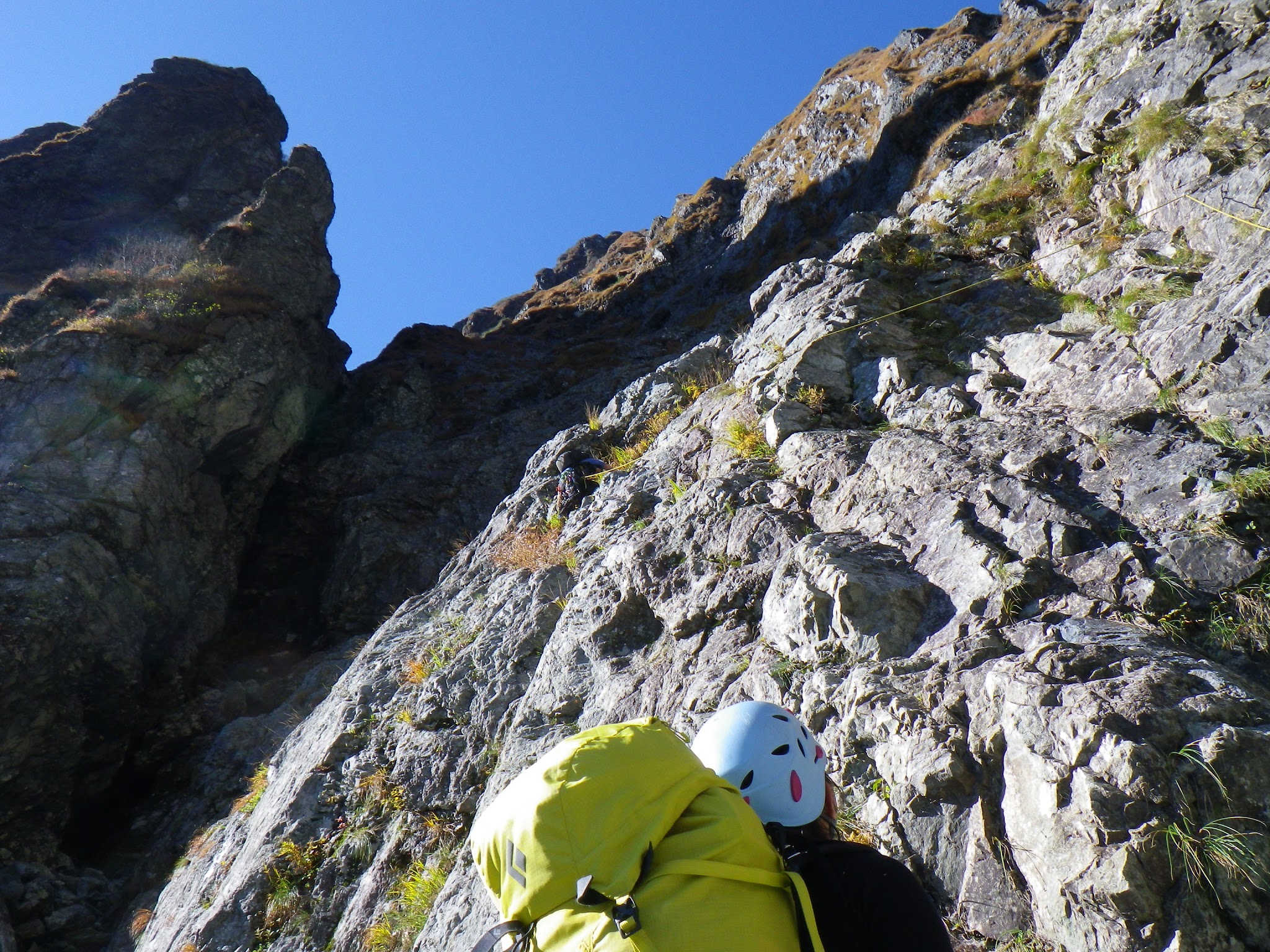 まずはF滝の登攀。一見簡単そうだがロープを出して左壁を登る。上部は沢登りで出てきそうな脆い岩壁の草付きとなっておりS木さんは苦戦気味。