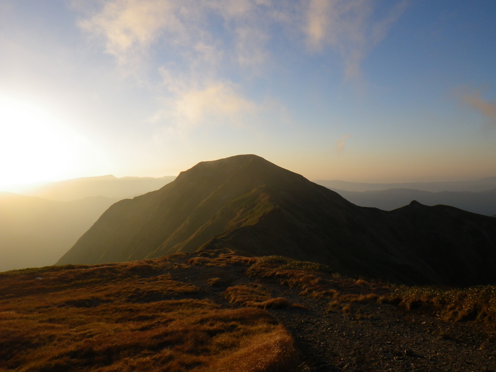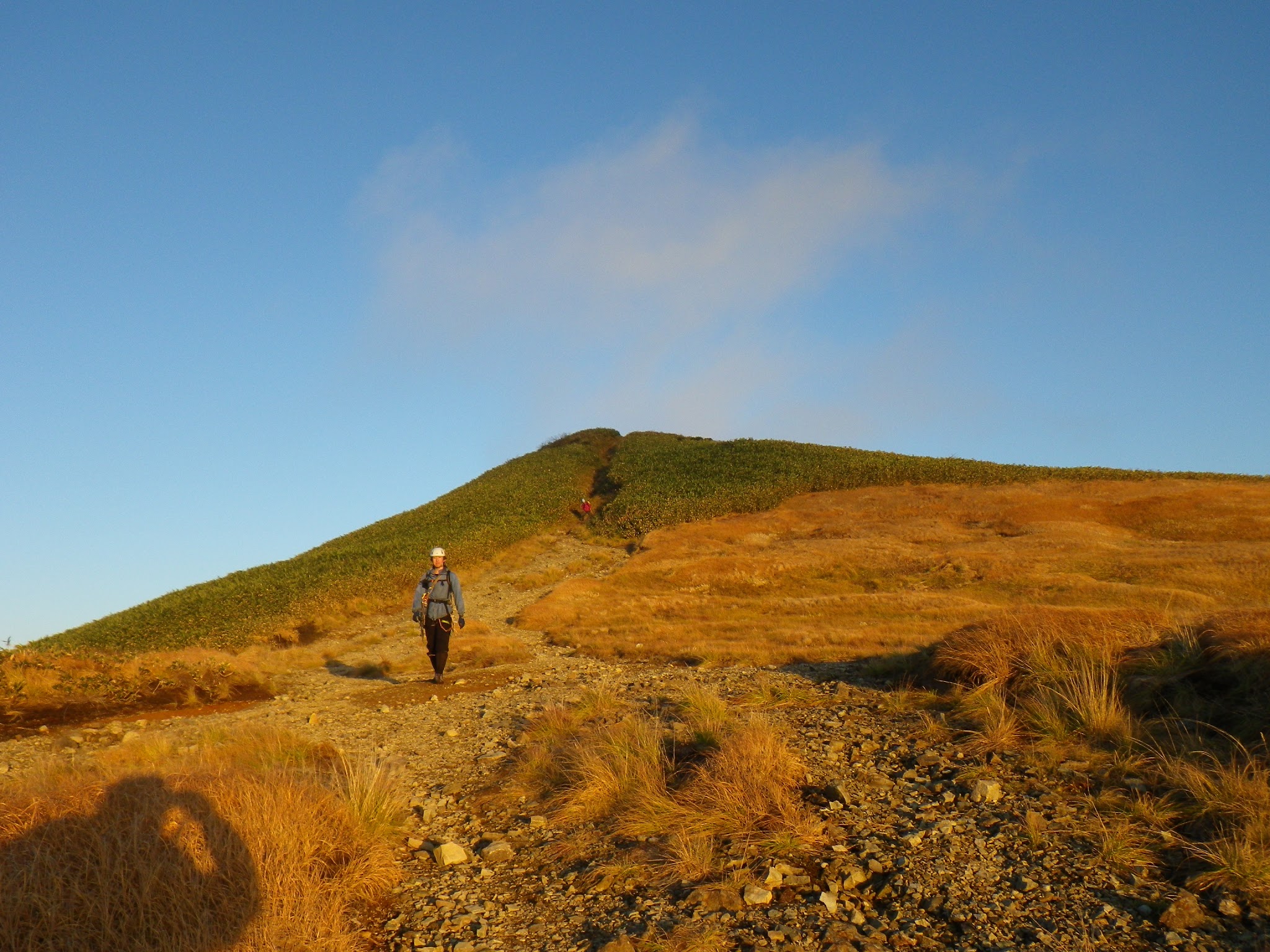 本谷のツメは右手尾根に向かって伸びている源頭チックな沢沿いを進む。登りやすいが、斜度が出てくると高度感もあり多少緊張する。一ノ倉の尾根に飛び出した後は、踏み跡を辿って一ノ倉岳の山頂へ。黄昏時の幻想的な稜線を辿って、登山客で賑わう茂倉の避難小屋に駆け込んだ。