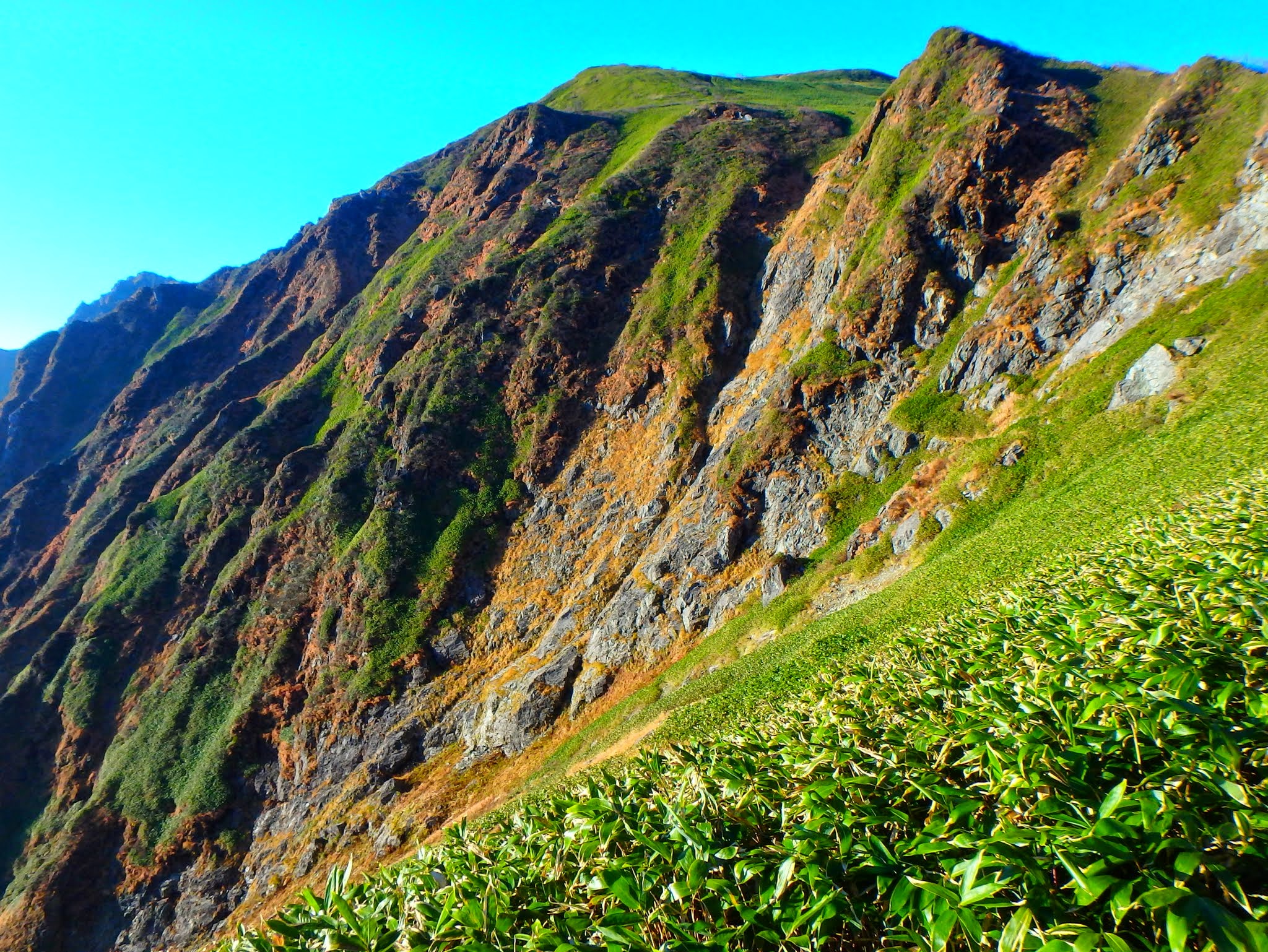 翌日は下山するだけだが、せっかくなので幽ノ沢の偵察も兼ねて上級者向け登山道とされている中芝新道を下ることにする。中芝新道の上部はかなり滑りやすく、みな何度か転びながら下りる。中間部では幽ノ沢各ルートの上部がチェックできて今後の参考になった。